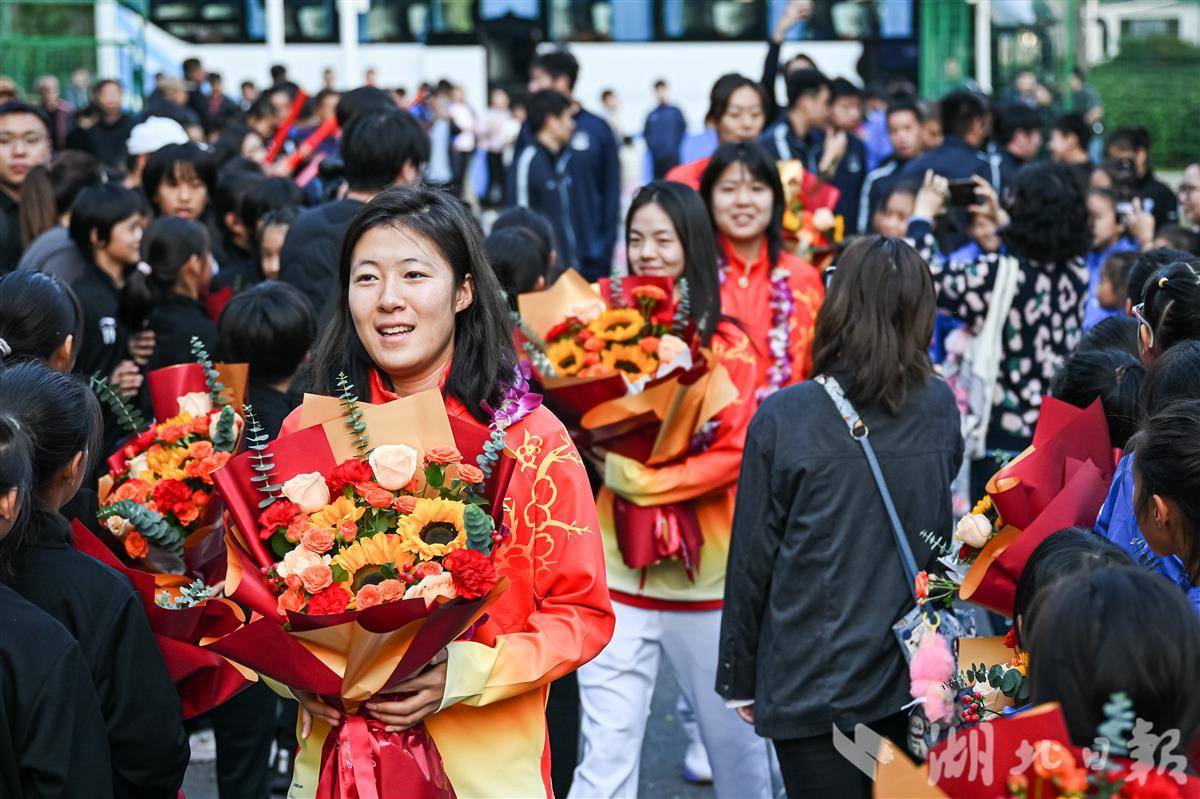 11月16日,在武汉塔子湖体育中心,湖北女足载誉归来,现场收获鲜花和掌声。(湖北日报全媒记者 任勇 摄)