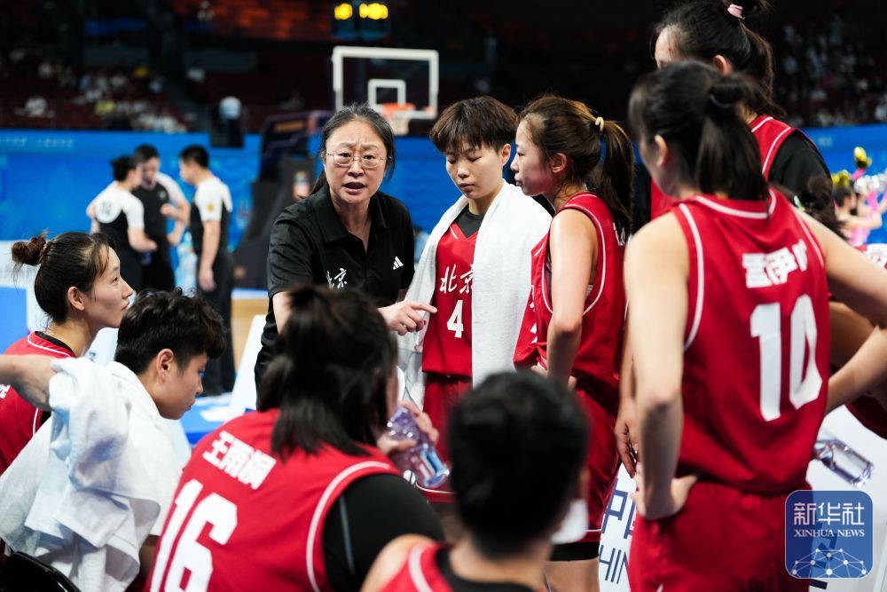 ↑ 北京队主教练何军(左三)在比赛间隙布置战术。