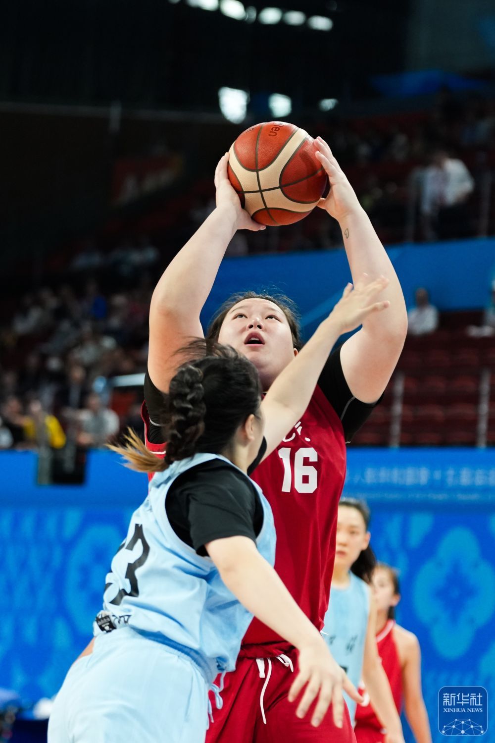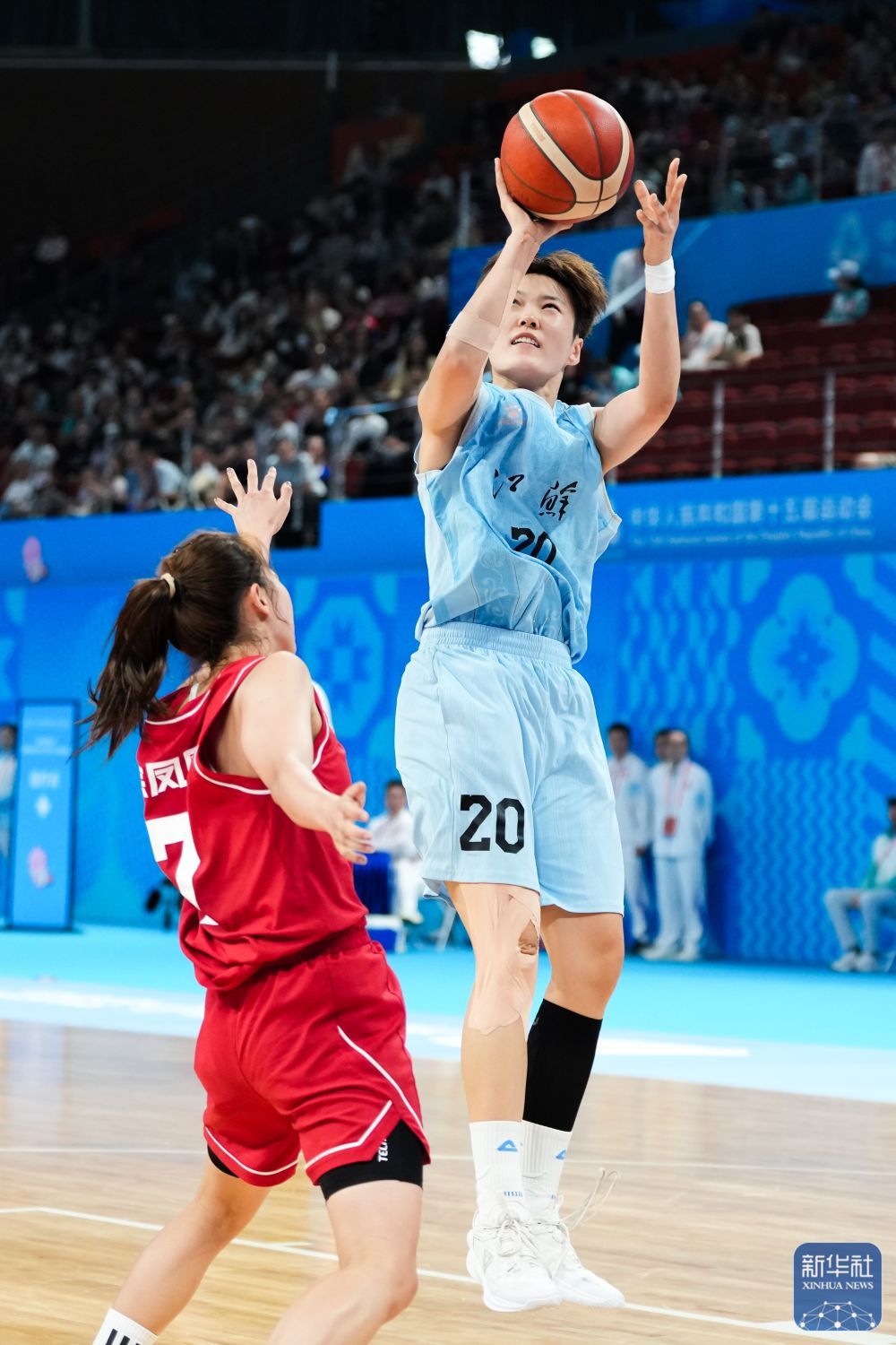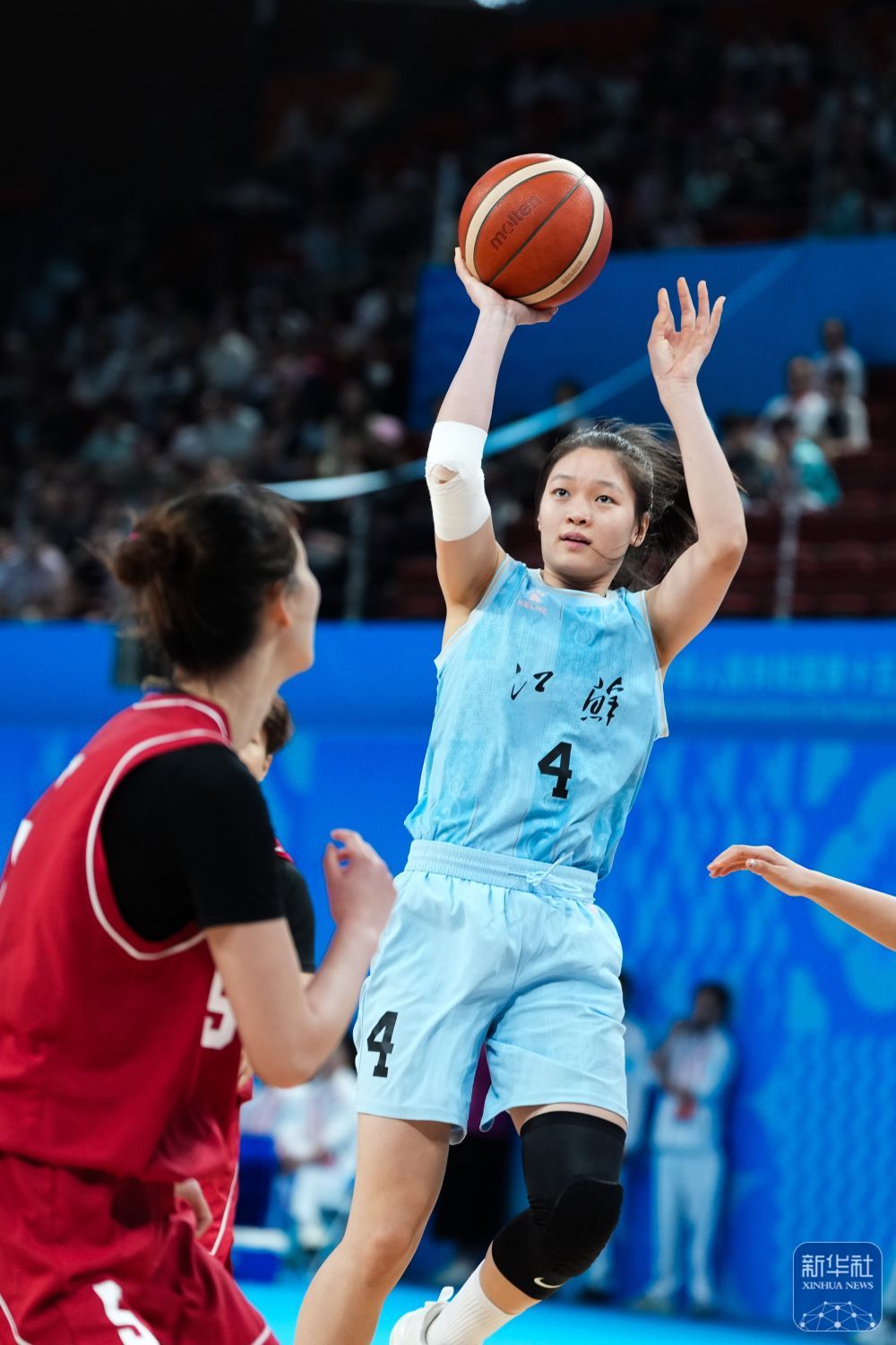 ↑ 江苏队球员赵紫茹(右)在比赛中投篮。