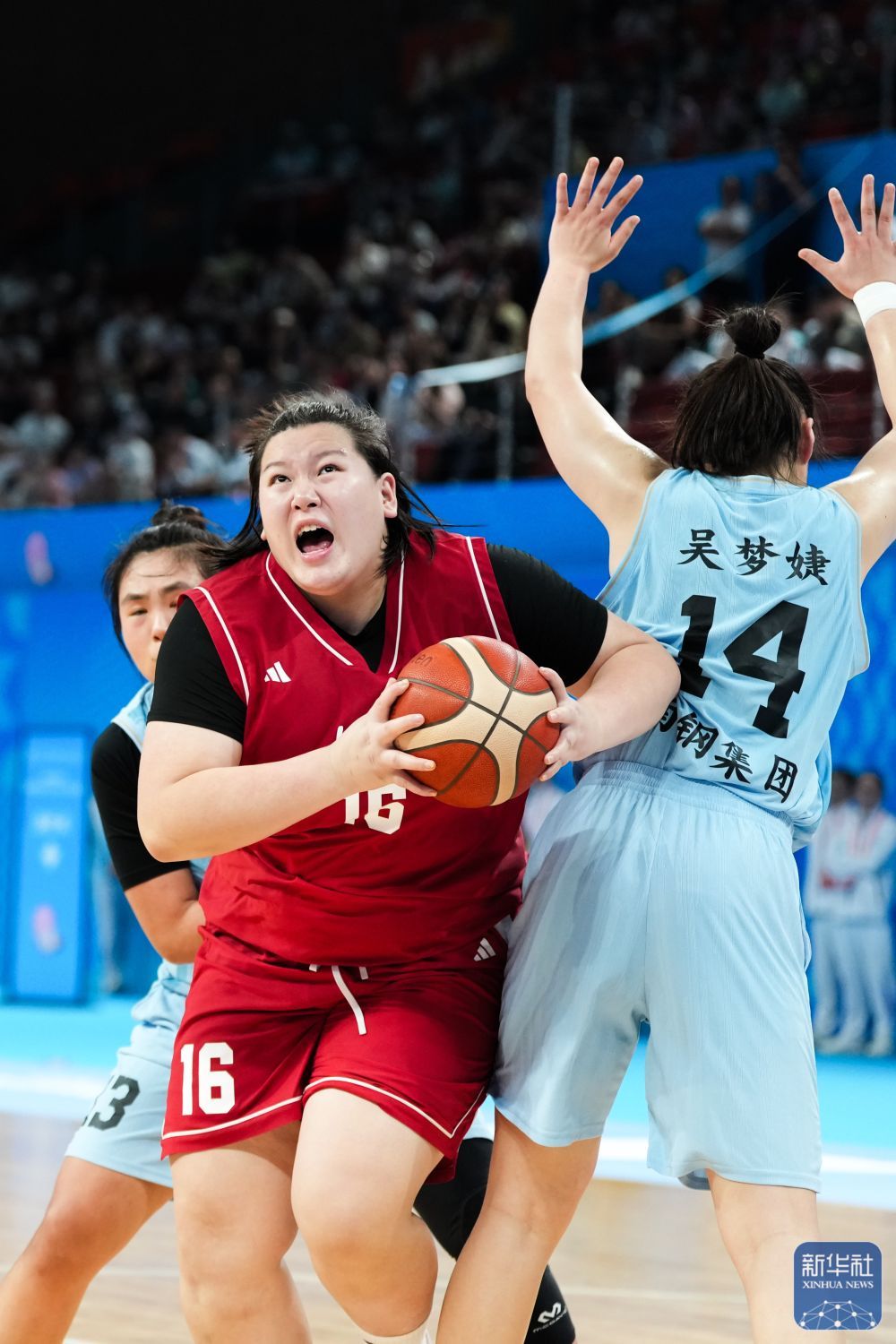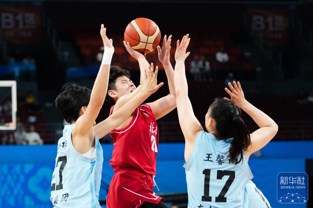 ↑ 北京队球员王雨桐(中)在比赛中上篮。