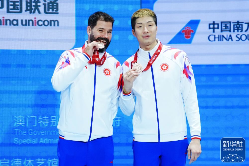 ↑ 获得季军的香港队选手张家朗(右)与教练在颁奖仪式上。 新华社记者 朱炜 摄