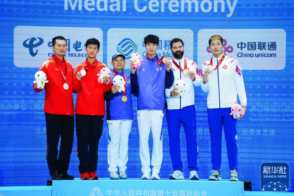 ↑ 获得冠军的福建队选手许杰(右三)、获得亚军的江苏队选手邹天一(左二)、获得季军的香港队选手张家朗(右一)在颁奖仪式上与教练合影。 新华社记者 朱炜 摄