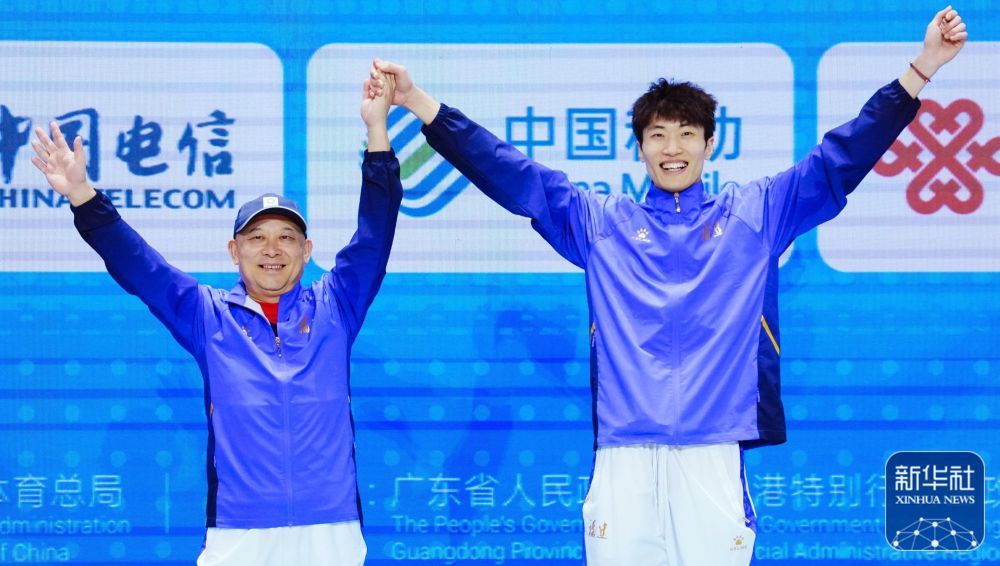 ↑ 获得冠军的福建队选手许杰(右)与教练在颁奖仪式上。 新华社记者 朱炜 摄