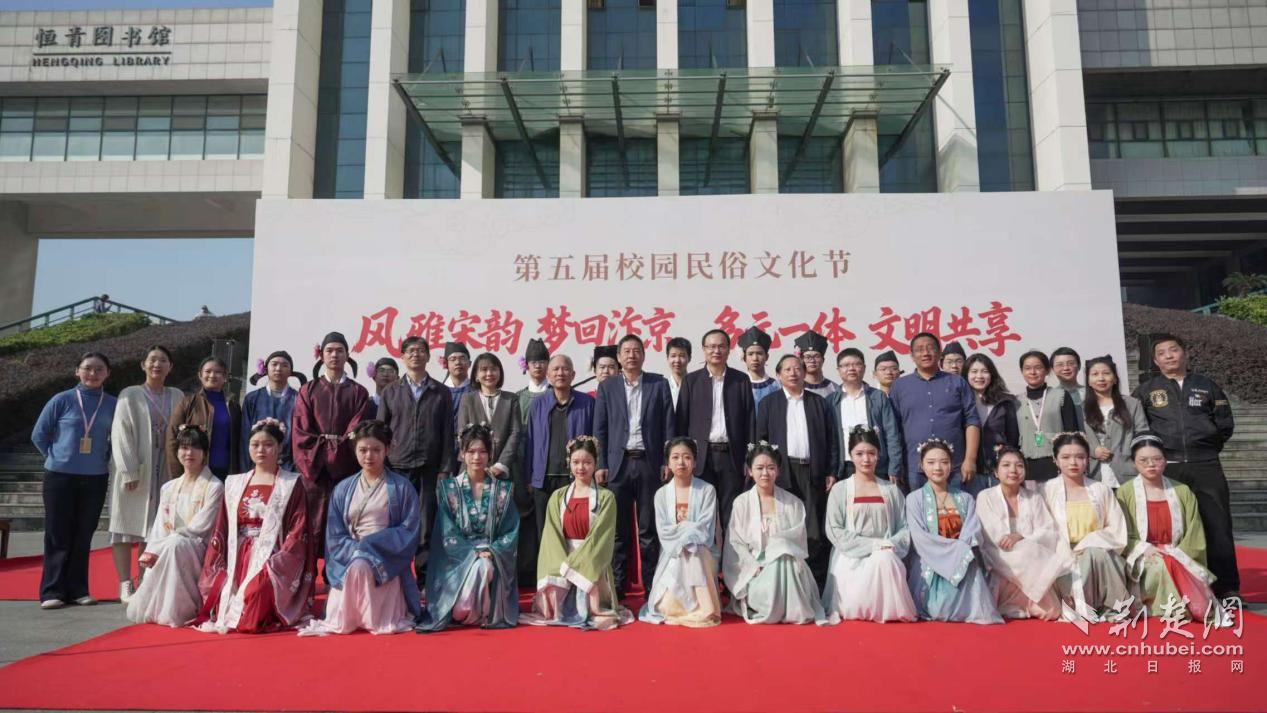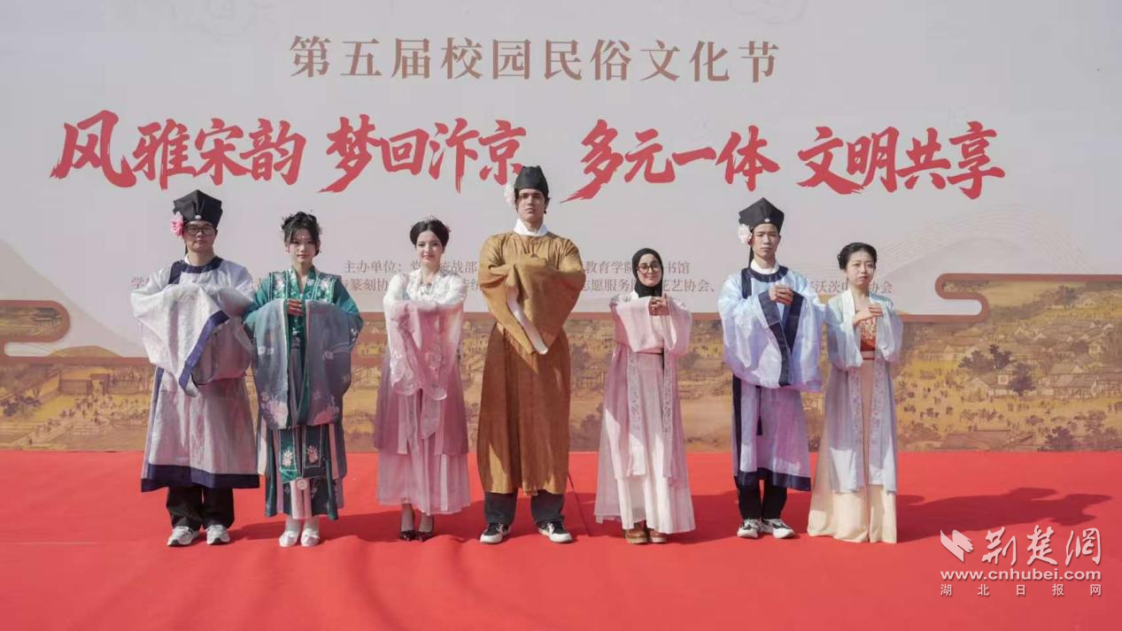 荆楚网(湖北日报网)讯(记者唐天琪 通讯员库琰倪、周文慧)茶香氤氲,词韵悠扬。11月13日,以“风雅宋韵 梦回汴京”为主题的校园民俗文化节在武汉轻工大学拉开帷幕。师生们身着雅致宋服,体验投壶簪花之乐,品味七汤点茶之妙,在沉浸式互动中完成了一场与历史的对话。