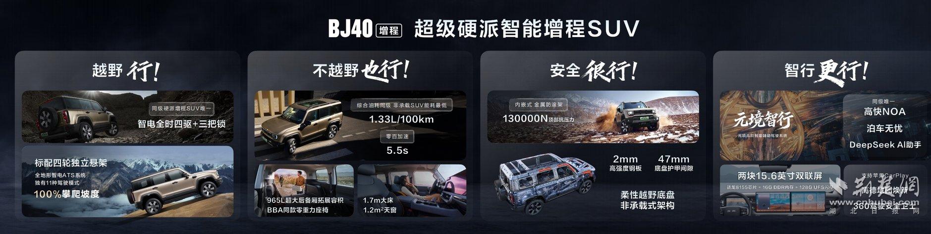 北京越野董事长王昊表示,作为中国越野车发明者,北京越野开创了属于中国人自己的越野车品类。BJ40增程为全球用户开辟了一个全新品类——“硬派增程SUV”,自上市后至今交付量已经突破三万台。北京越野会在这个市场持续创新,迭代优化,把更好、更多、更行的产品带给大家!BJ40增程元境智行就是越野行!不越野也行!安全很行!智行更行!智行硬派SUV,就买BJ40增程。
