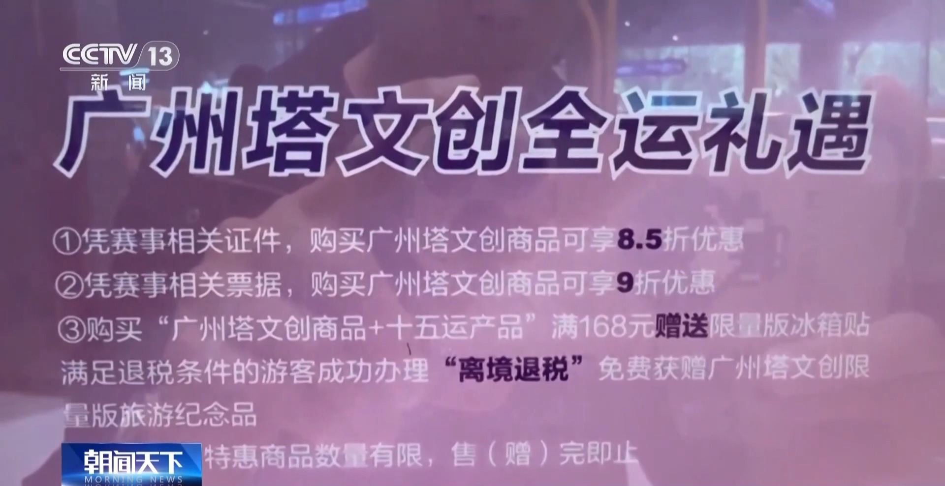 在广州塔,持赛事门票可享受6折起的全运主题联票,包括433米白云星空观光层+蜡像馆联票等,同时餐饮、购物等参与满减及折扣。让各地游客把广州地标记忆与运动热情,一同带回家。
