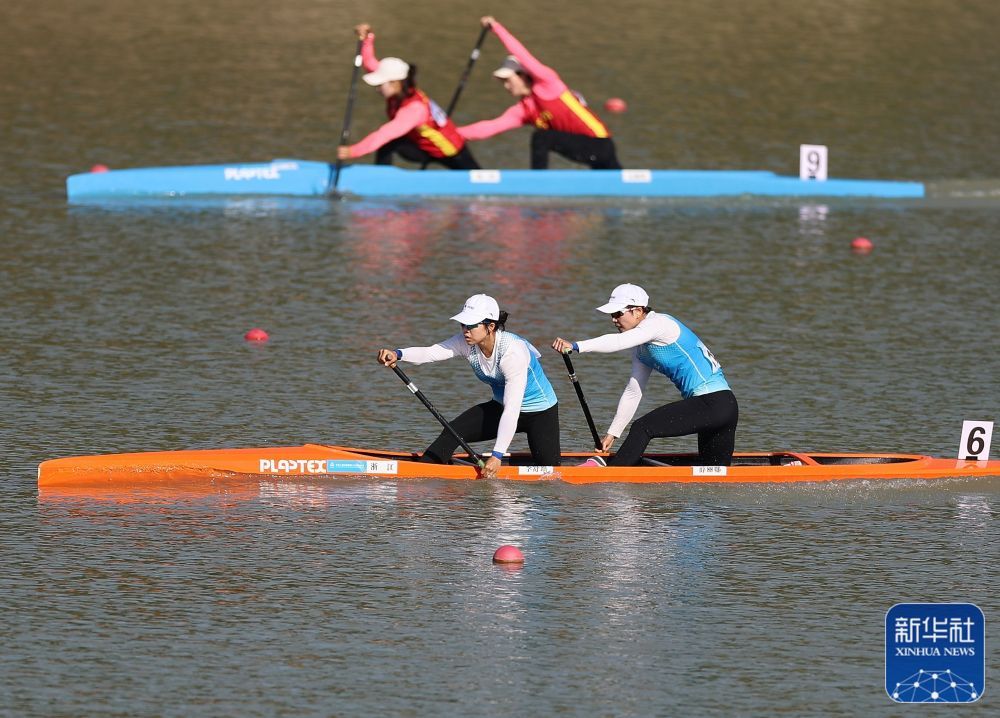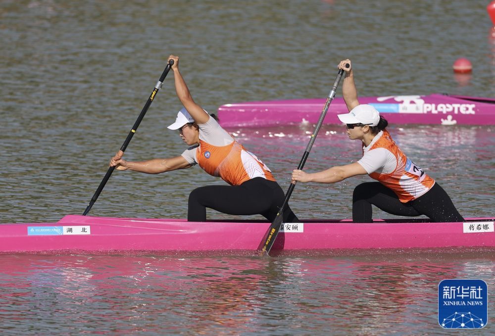 ↑ 湖北队选手滕安硕(前左)/蒋希娜(前右)在女子500米双人划艇决赛A中。最终,她们获得亚军。 新华社记者 晋美多吉 摄
