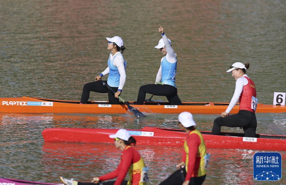 ↑ 浙江队组合李舒琪(上左)/薛丽娜(上右)在女子500米双人划艇决赛A后庆祝。最终,她们夺得冠军。 新华社记者 杨世尧 摄
