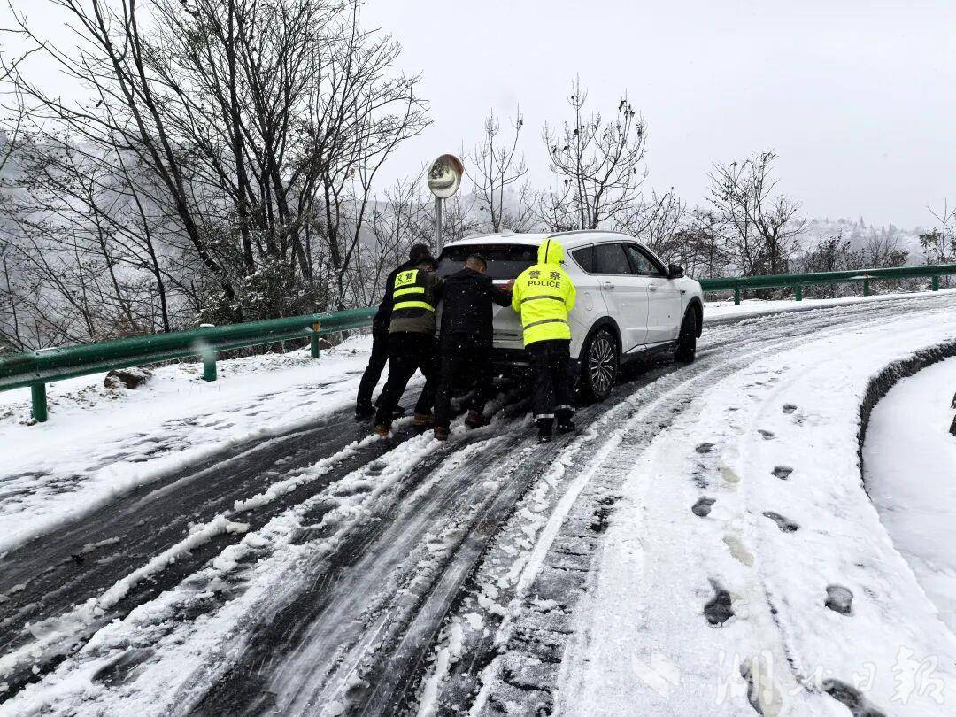 17日早晨,救援在多个角落同步展开。竹溪县桃源乡,一辆白色越野车在急弯处打滑。救援队负责人孙子绪与村民围拢上来,为车辆加装防滑链,双手冻得通红,仍一节节扣紧链条。丹江口市油瓶观村,车辆陷入雪窝失去动力,派出所副所长朱峰组织村民齐力上前,“一、二、三——推!”号子在风雪中格外响亮。