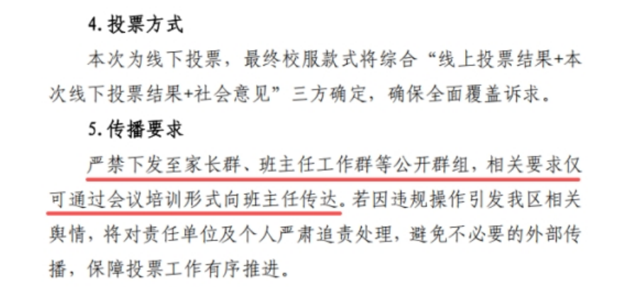 根据沈阳市发布的工作细则及解读文件,本次校服款式投票采用“线上+线下”结合模式,线下投票由学校组织学生及家长填写纸质投票单,最终款式将综合线上线下投票结果及社会意见确定。但在传播要求上,文件特别强调“避免不必要的外部传播”,明确禁止将投票相关信息、投票单模板等下发至各类公开群组,仅允许通过线下会议培训向班主任单向传达。文件解释,此举是为“保障投票工作有序推进”,防止违规操作引发舆情。