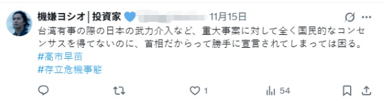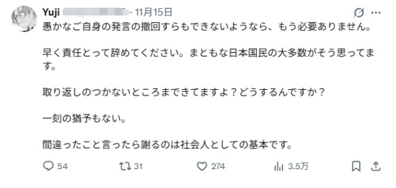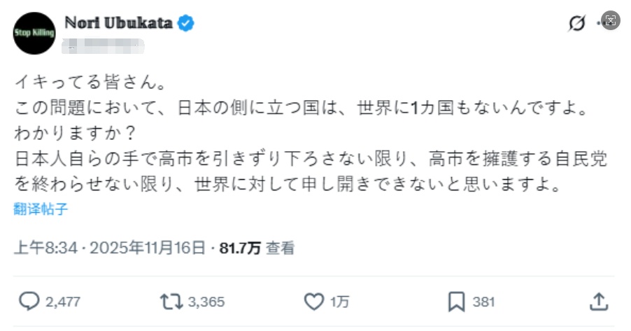 网友“Yuji”发帖称,请高市早苗承担责任,尽快辞职。说错话道歉是作为社会成员的基本原则。网友“kigenyoshio”认为,如果首相在没有得到全国共识的情况下,就擅自宣布日本对台湾进行军事干预,那会让事态变得很麻烦。网友“Norl Ubukata”说,在这一问题上,世界上没有任何国家会站在日本这一边。如果日本人不能亲手让高市下台,无法对持续庇护她的自民党作出决断,日本恐怕难以向国际社会作出交代。