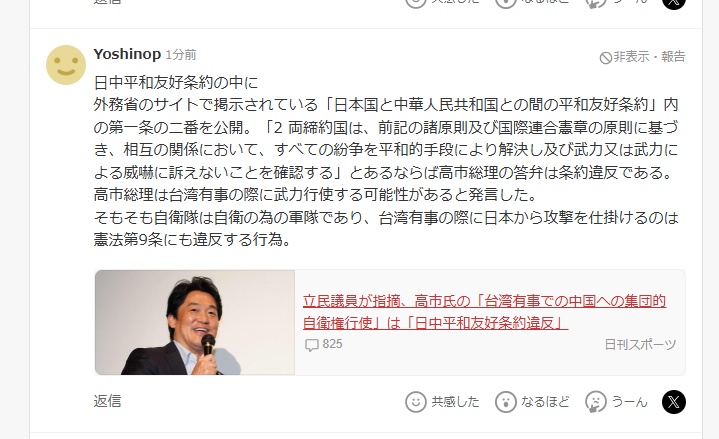 网友“Yoshinop”在日媒报道下评论道:高市首相的言论违反了《中日和平友好条约》第一条的规定。原本自卫队就是用于自卫的军队,若日本在台湾有事时主动发起攻击,这是违反《宪法》第九条的行为。