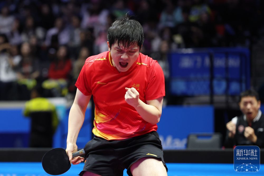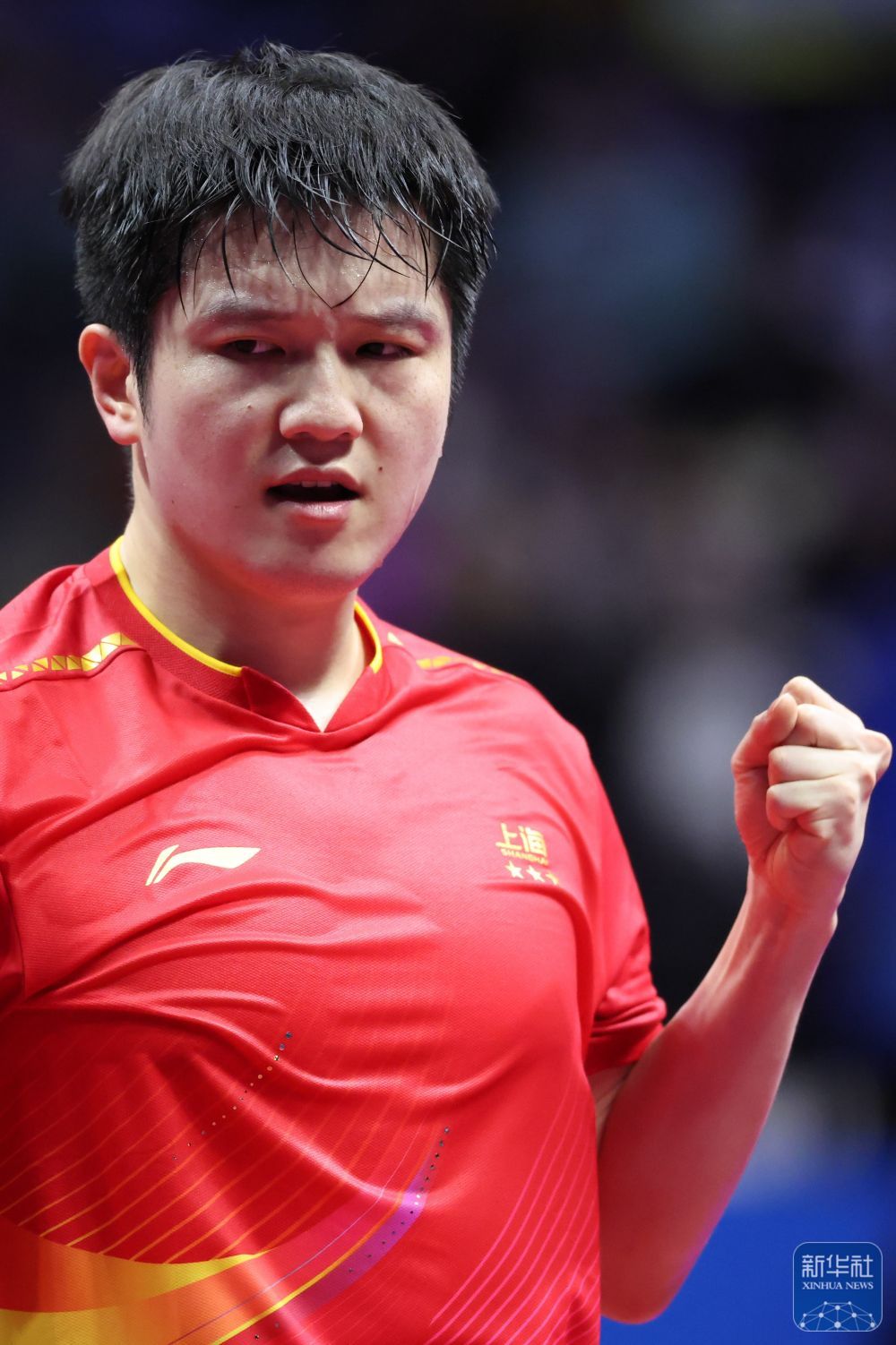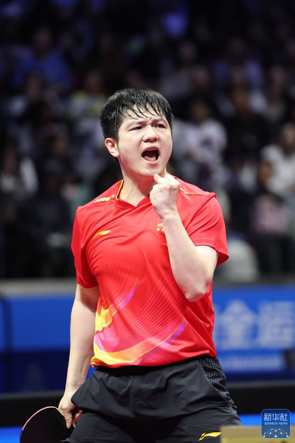 ↑ 上海队选手樊振东在比赛中庆祝。他3比2战胜河北队梁靖崑。新华社记者 梁旭 摄