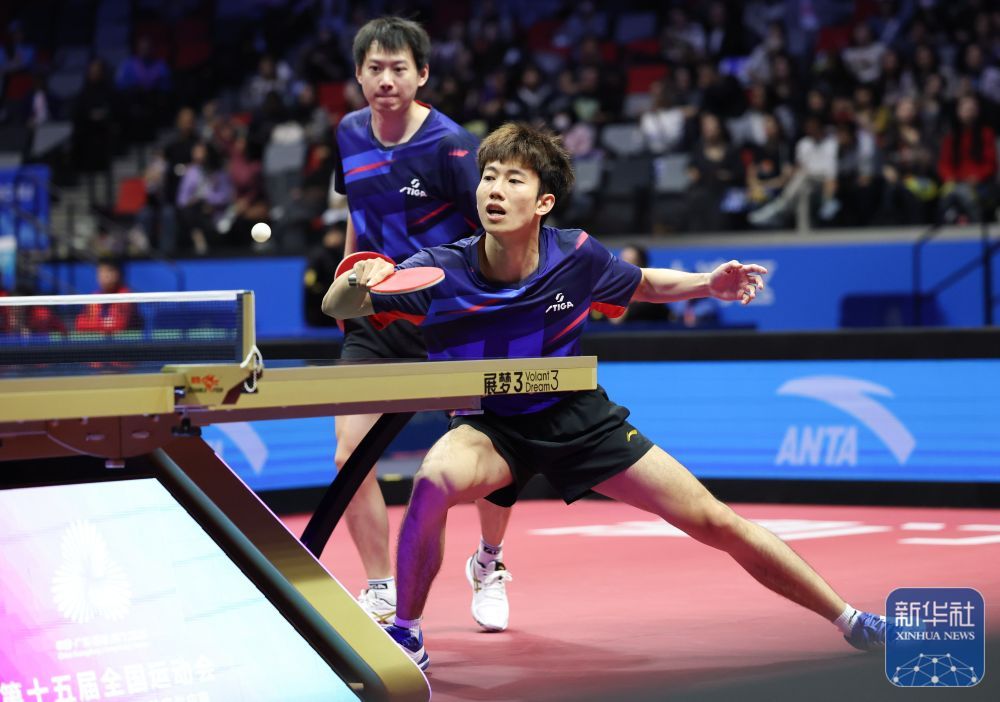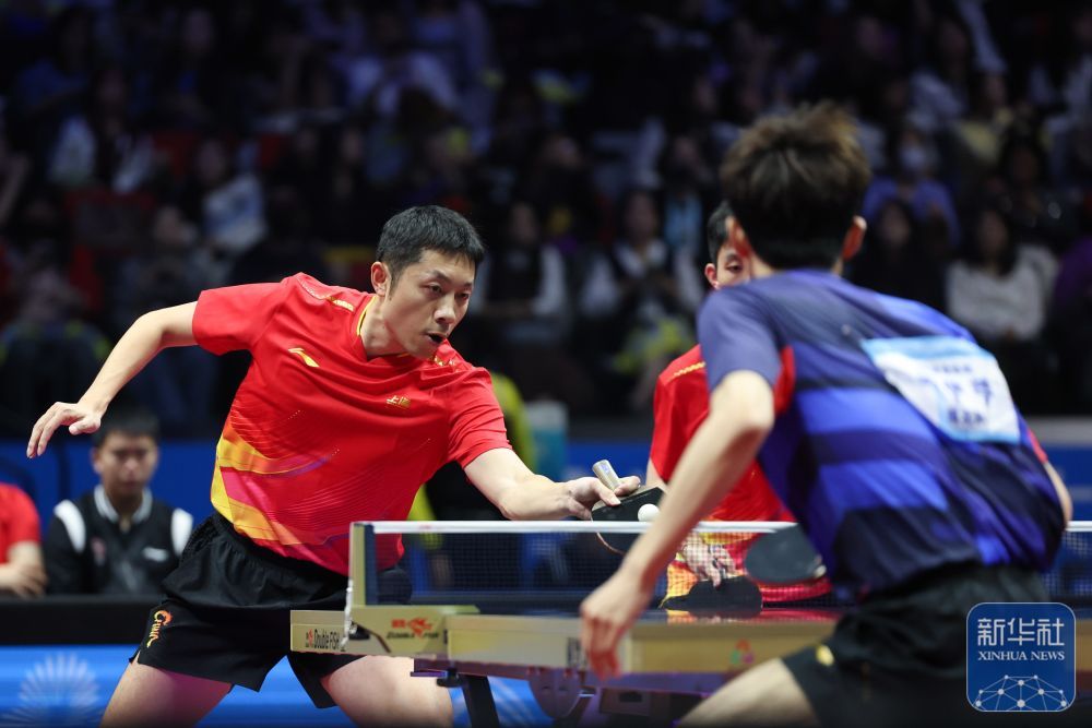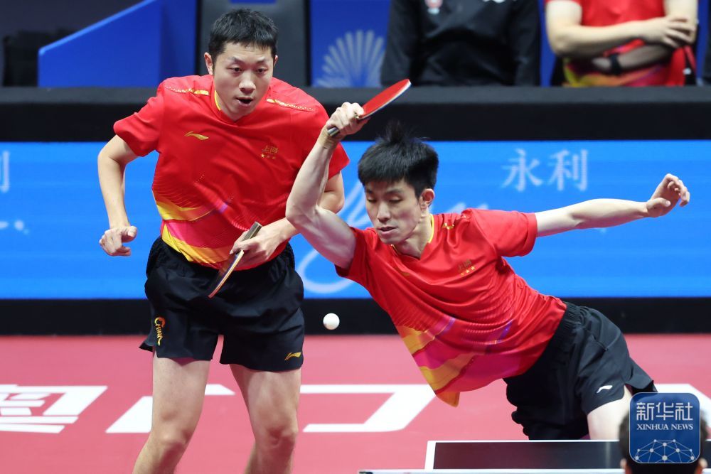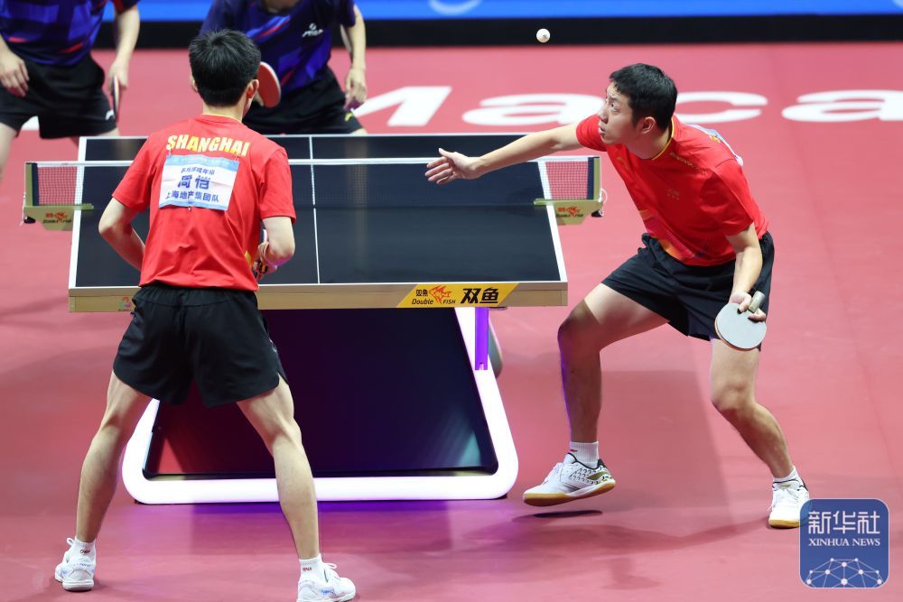 ↑ 上海队组合许昕(左)/周恺在比赛中,他们在双打比赛中3比1战胜河北队组合周雨/梁俨苧。新华社记者 梁旭 摄