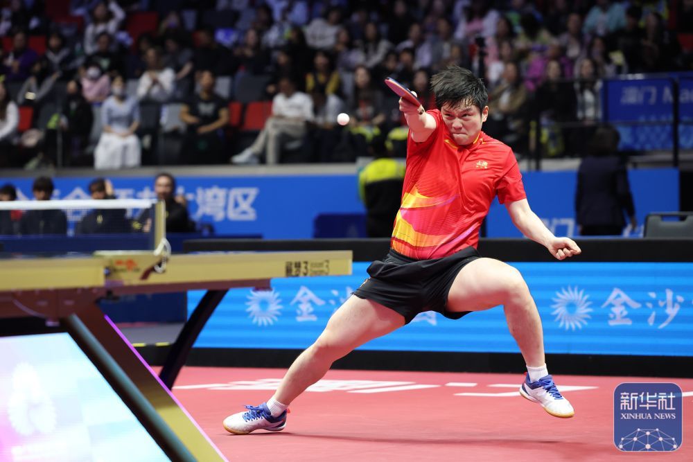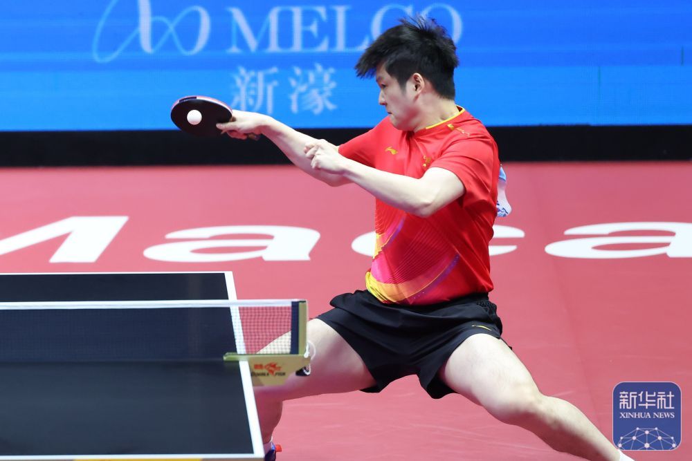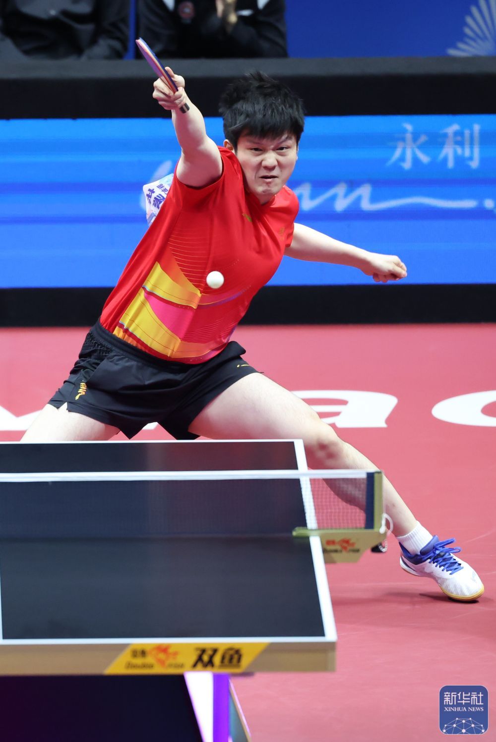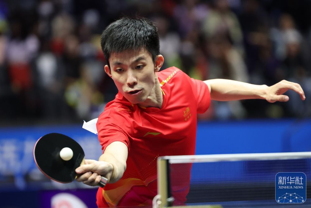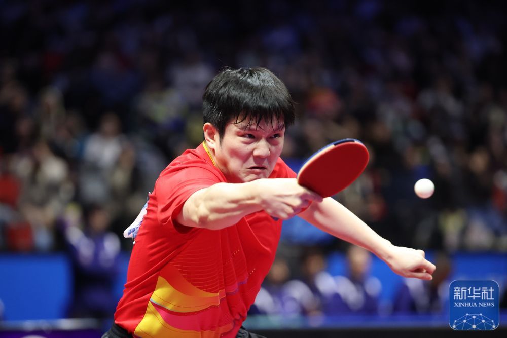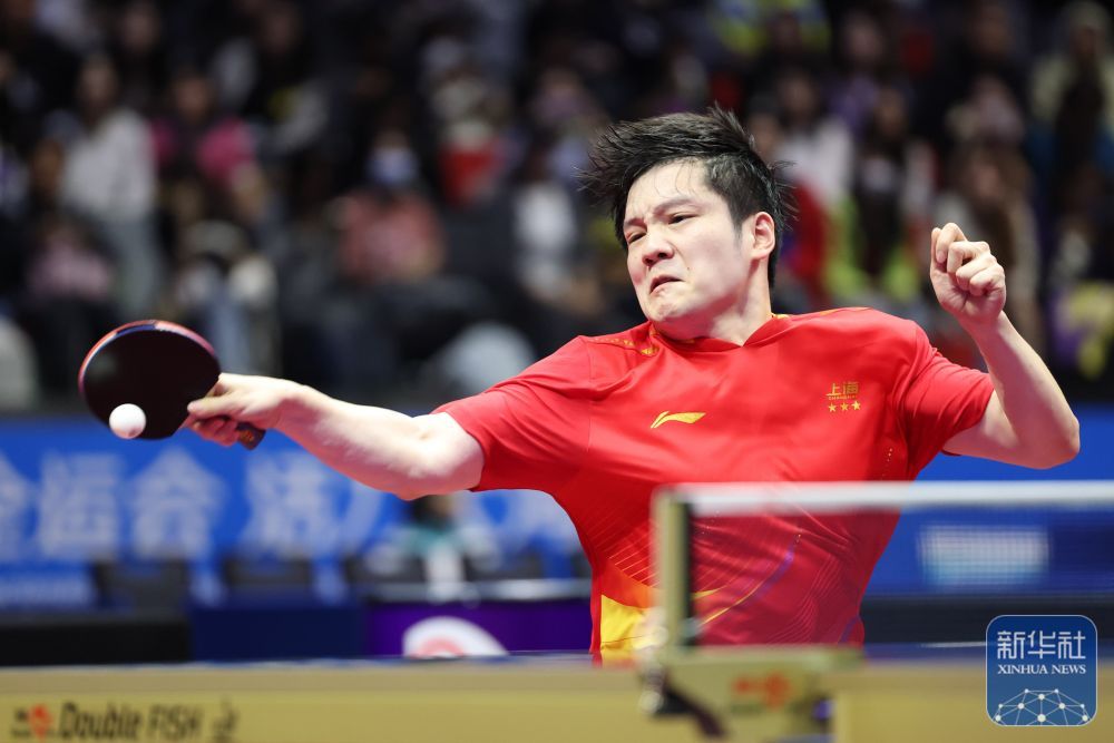 ↑ 上海队选手樊振东在比赛中回球。他3比2战胜河北队选手梁靖崑。新华社记者 刘续 摄