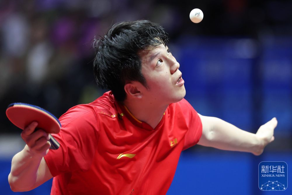 ↑ 河北队选手梁靖崑在比赛中回球。他2比3不敌上海队选手樊振东。新华社记者 梁旭 摄