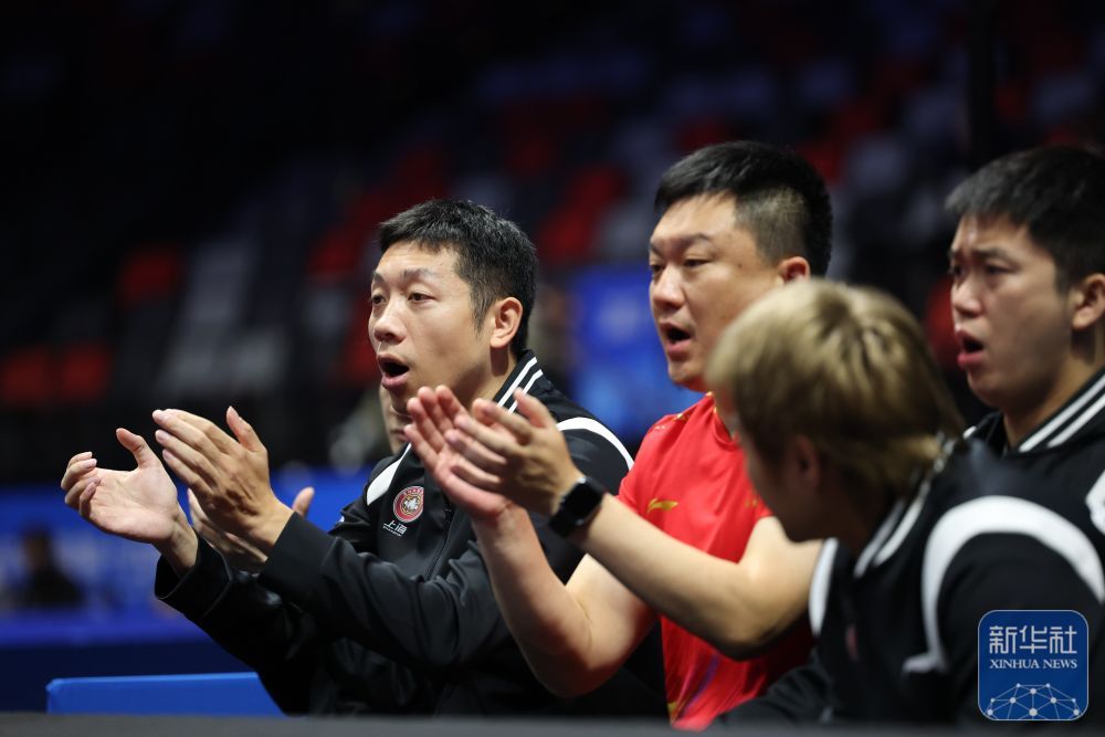 ↑ 上海队选手许昕(左一)在场边为场上队友加油。新华社记者 梁旭 摄