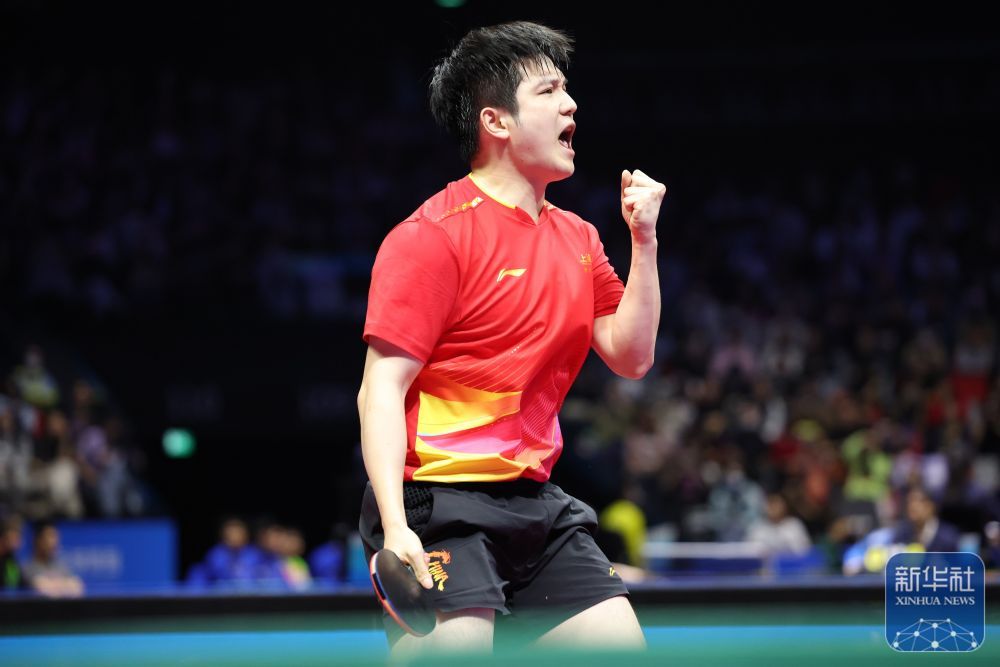 ↑ 上海队选手樊振东在比赛中庆祝。他3比2战胜河北队选手梁靖崑。新华社记者 刘续 摄