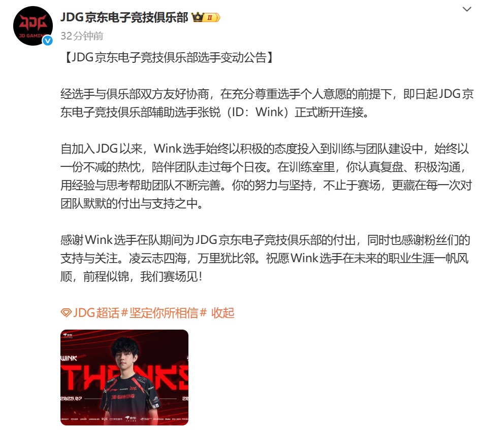 11月18日,JDG英雄联盟俱乐部官方账号@JDG京东电子竞技俱乐部 发布选手变动公告:经选手与俱乐部双方友好协商,在充分尊重选手个人意愿的前提下,即日起JDG京东电子竞技俱乐部英雄联盟辅助选手张锐(ID:Wink)正式断开连接。