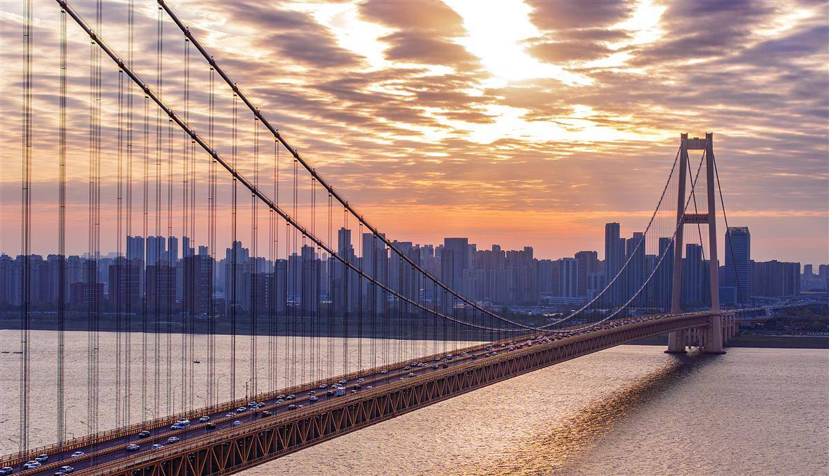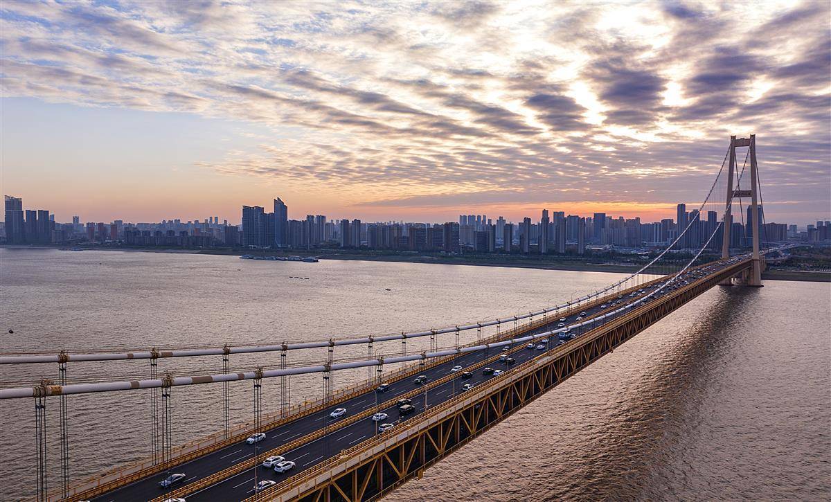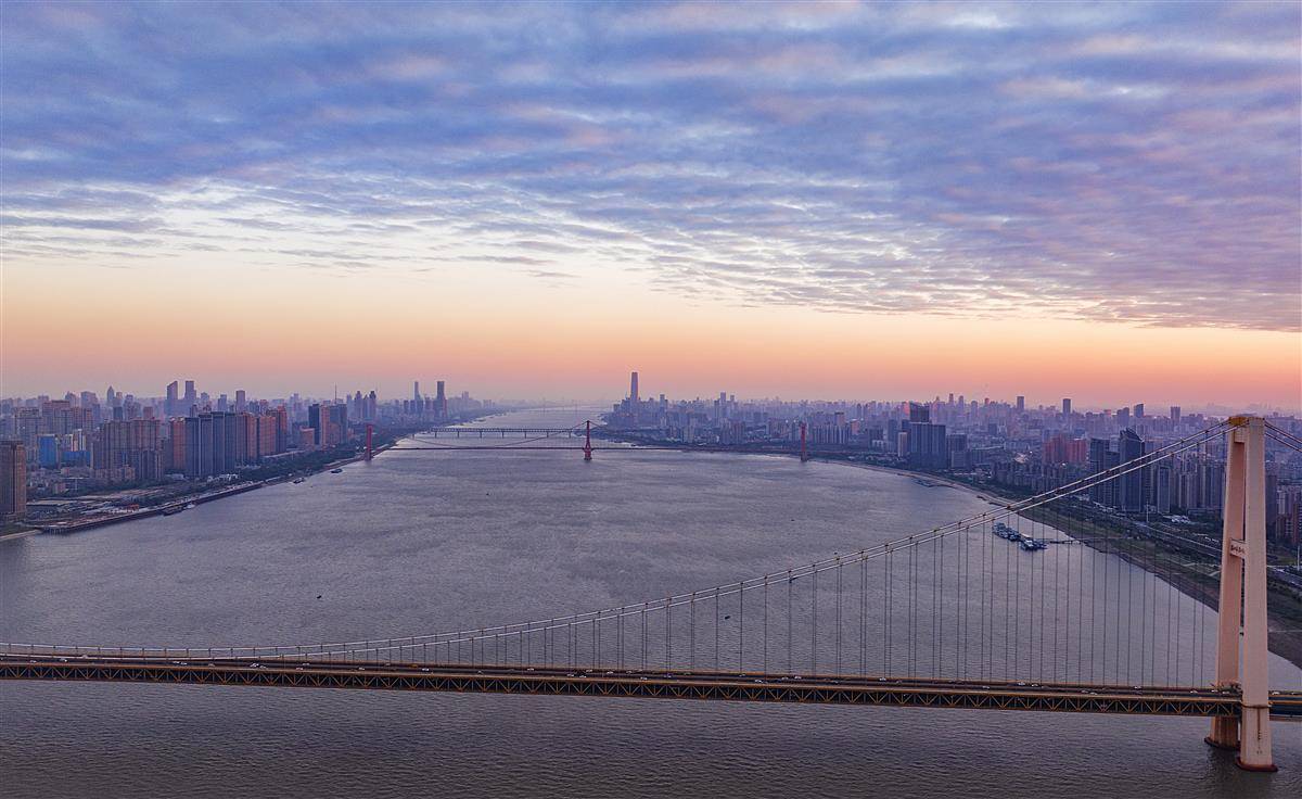 11月18日清晨,武汉上空出现绝美的朝霞,“鱼鳞云”在杨泗港长江大桥上空飘浮,使天空格外美丽、壮观。