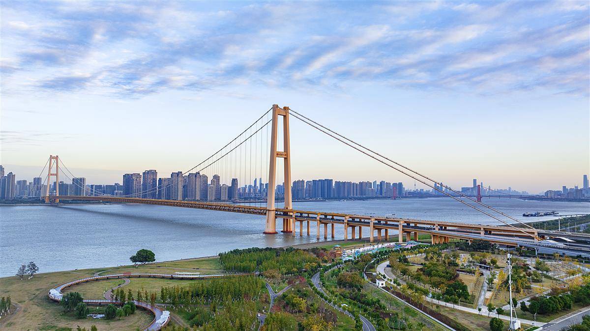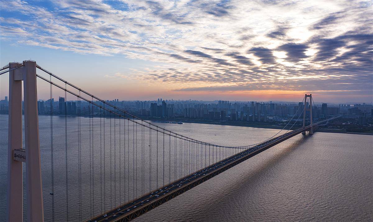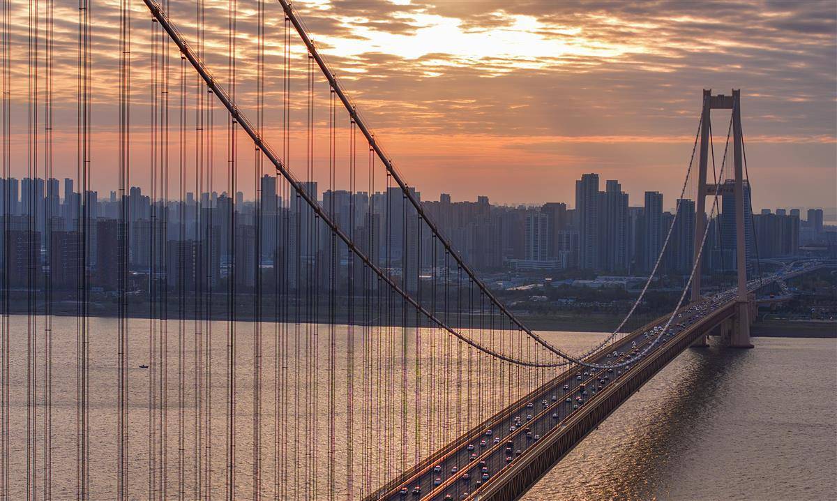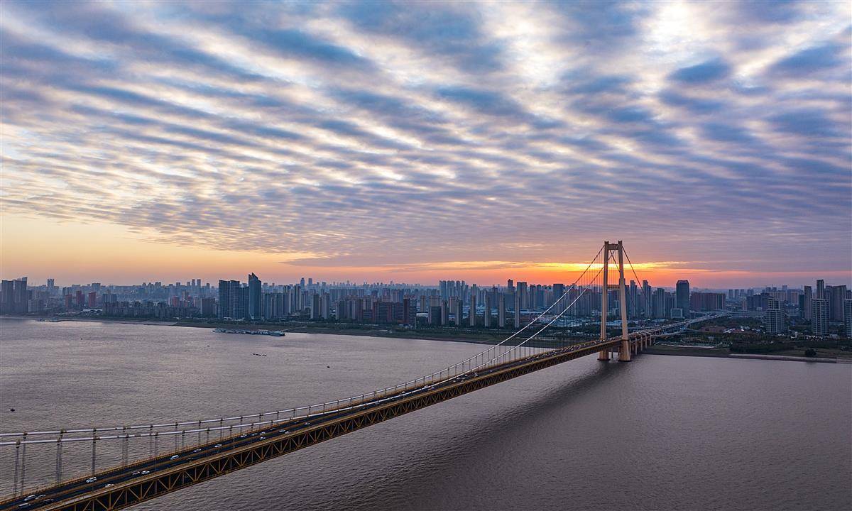 11月18日清晨,武汉上空出现绝美的朝霞,“鱼鳞云”在世界上跨度最长的公路悬索桥——杨泗港长江大桥上空飘浮,使天空格外美丽、壮观。因前日的一场雨,一场北风,吹走了雾霾,让江城的天空,呈现出如秋日般的高爽。(湖北日报全媒记者 朱熙勇 摄)