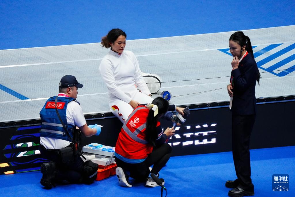 11月18日,北京队选手邢瑶(左二)在比赛中接受治疗。