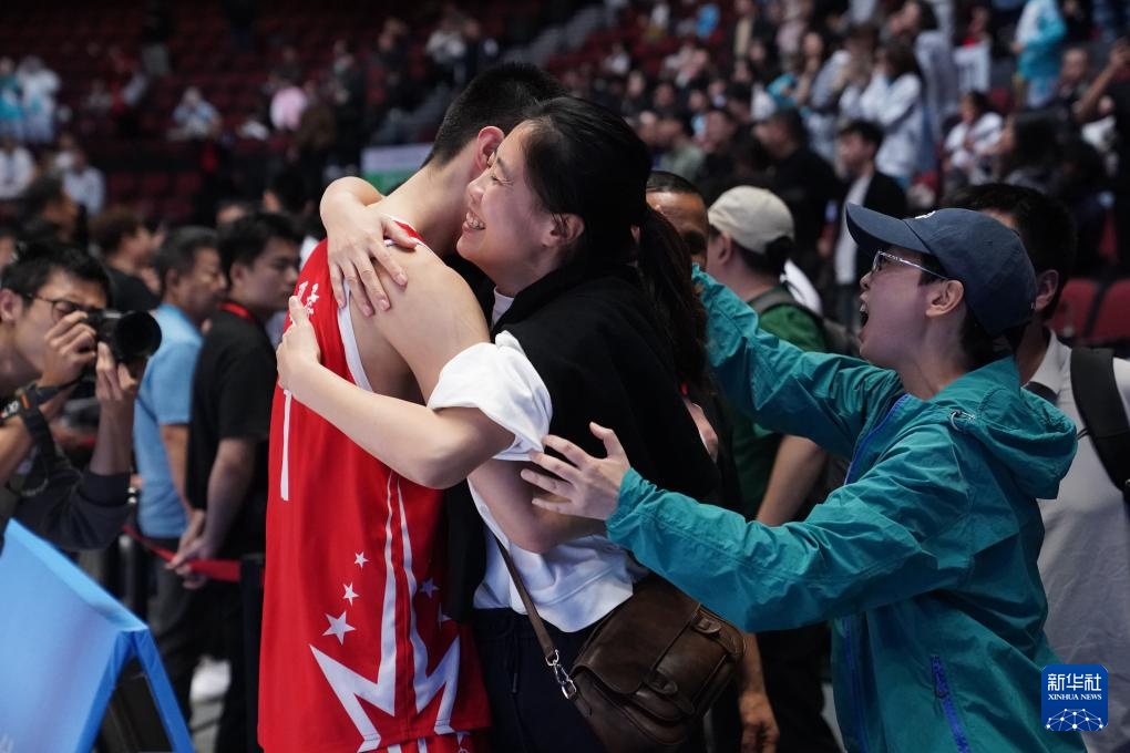 11月18日,广东队球员夏振峰(前左)在比赛后与家人拥抱。