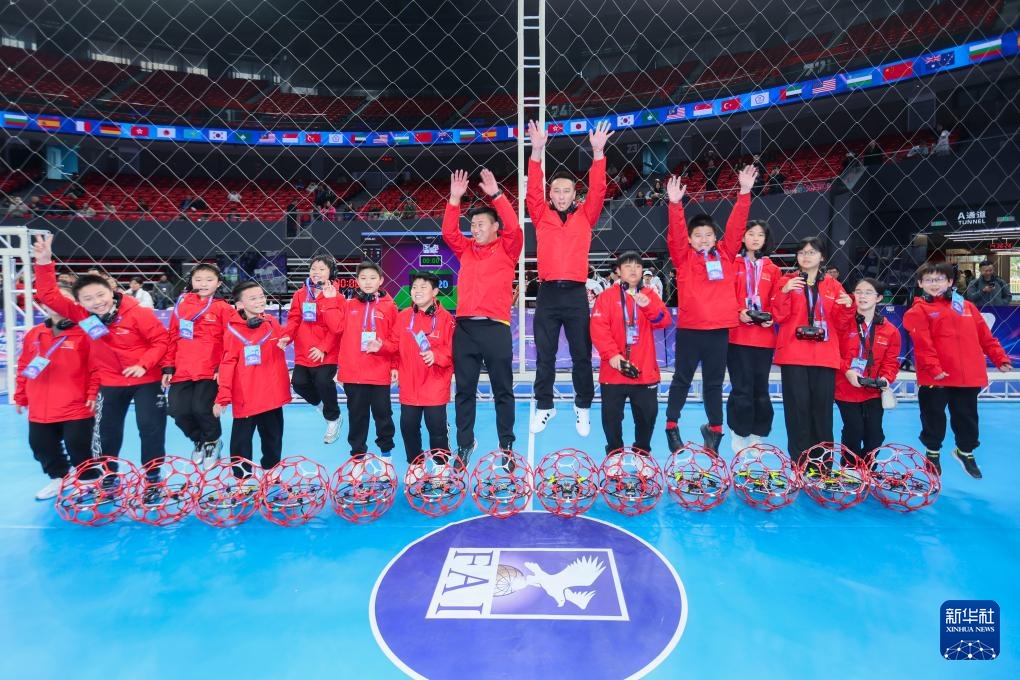 11月18日,中国队选手庆祝包揽F9A-A、F9A-B两个组别的冠亚军。