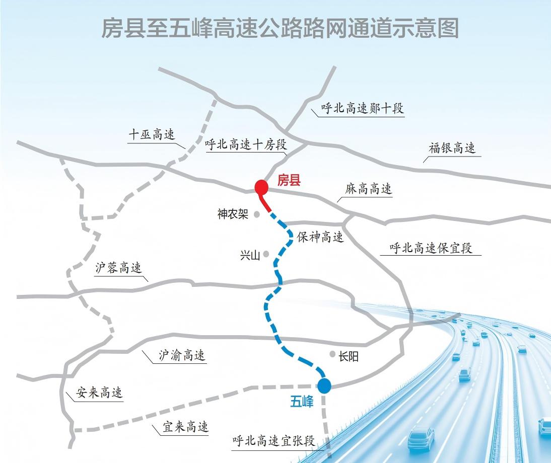 房五高速是《国家公路网规划》规划的一条国家高速公路,起点位于十堰市房县,终点位于宜昌市五峰土家族自治县,主要分成房县、神农架、兴山、兴长、五峰等5段修建,建设里程全长251公里,桥隧比达87.88%,为湖北省桥隧比最高的交通工程。其中,兴长段与房县段已动工,其他项目正在积极推进。