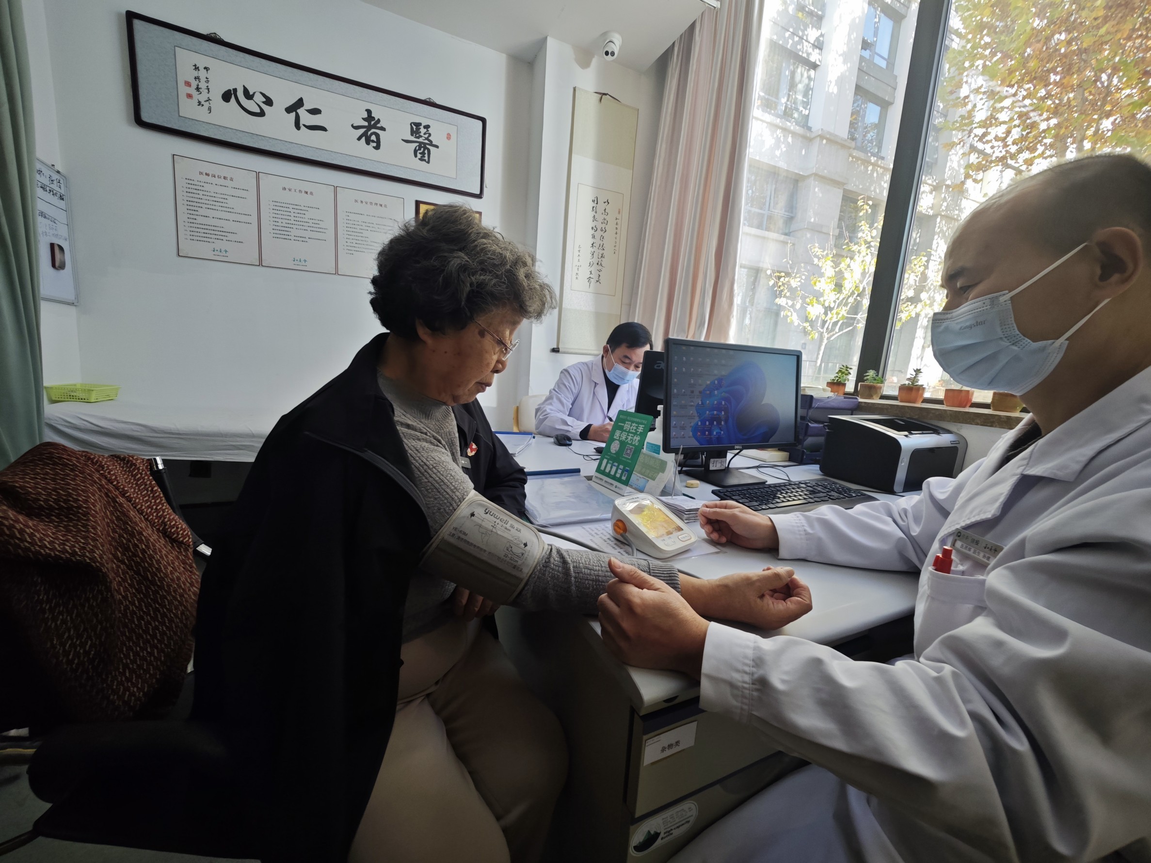 养老机构里的医务室里,老人正在测量血压。人民网记者 王天乐摄