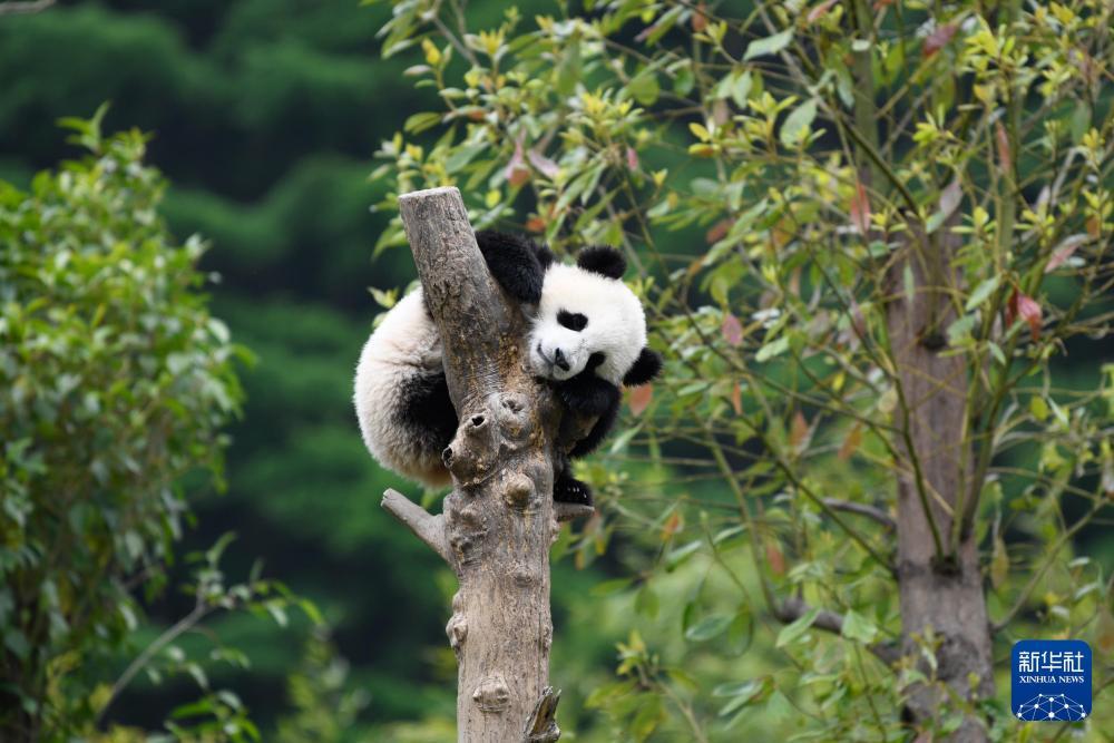 2022年4月24日,在中国大熊猫保护研究中心卧龙神树坪基地内,一只大熊猫在树上休息。新华社记者 胥冰洁 摄