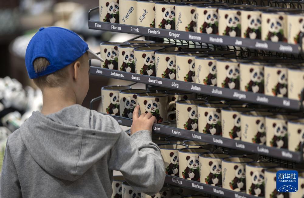 2017年7月5日,在德国柏林动物园,一名顾客挑选印有熊猫图案的杯子。新华社记者 费茂华 摄