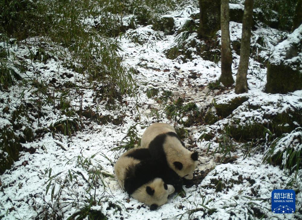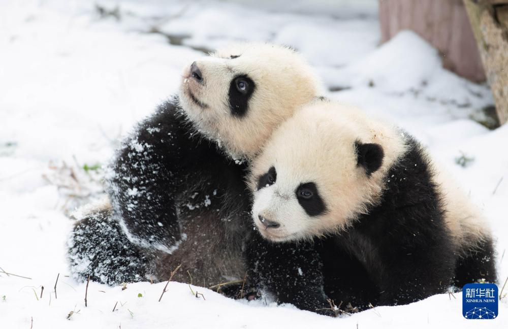 2020年12月17日,两只大熊猫幼崽在中国大熊猫保护研究中心卧龙神树坪基地的雪地里嬉戏。新华社记者 江宏景 摄