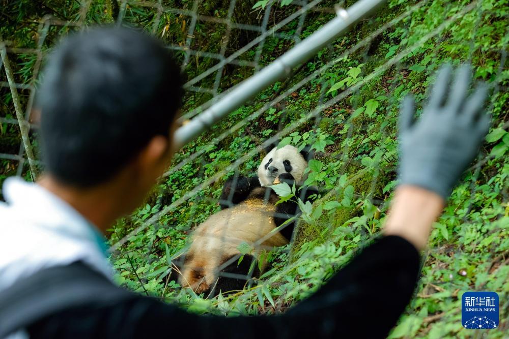 2024年6月24日,在位于大熊猫国家公园卧龙片区内天台山的大熊猫第二阶段野化培训场外,身穿“熊猫服”的工作人员牟仕杰给母熊猫“贤贤”投喂完食物后挥手向其告别。新华社记者 沈伯韩 摄