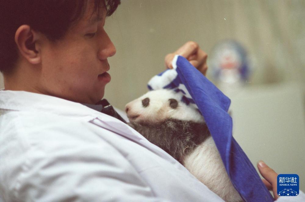 1999年,北京动物园的护理人员给待在育婴箱外的熊猫幼崽裹上条绒毯,防止它着凉。新华社记者 吕全成 摄