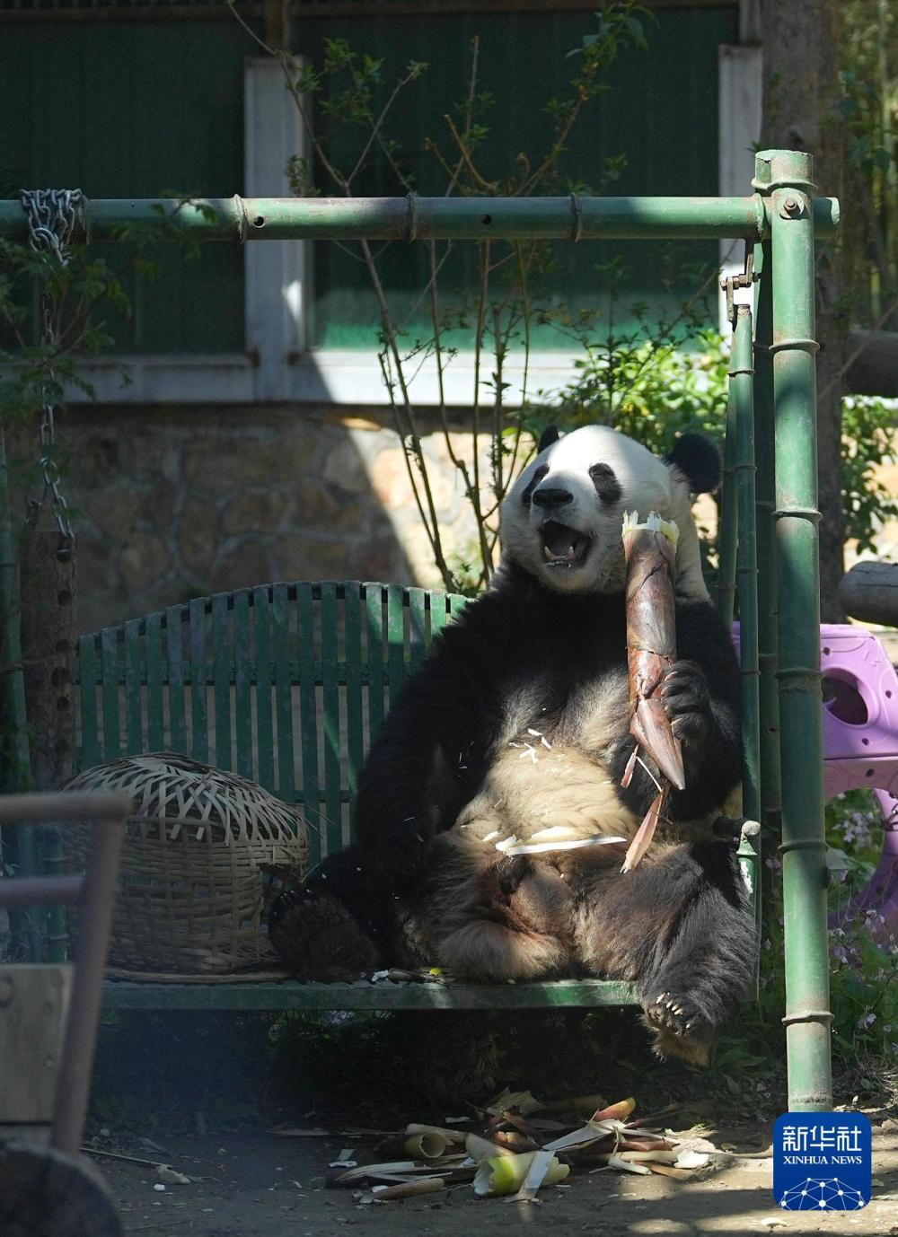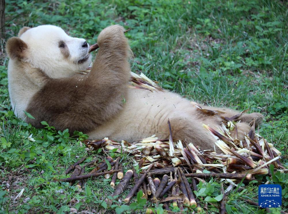 2023年5月29日,在成都大熊猫繁育研究基地都江堰野放繁育研究中心,大熊猫“梅兰”在吃竹笋。新华社记者 胥冰洁 摄