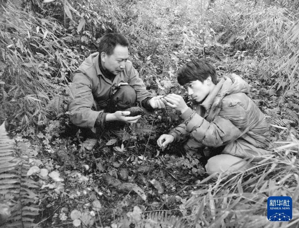“中国大熊猫之父”胡锦矗(左)和时任“五一棚”负责人王鹏彦(右)一起分析大熊猫的粪团,寻找它们的活动踪迹,以准确地投放补充饲料。新华社记者 金勖琪 摄