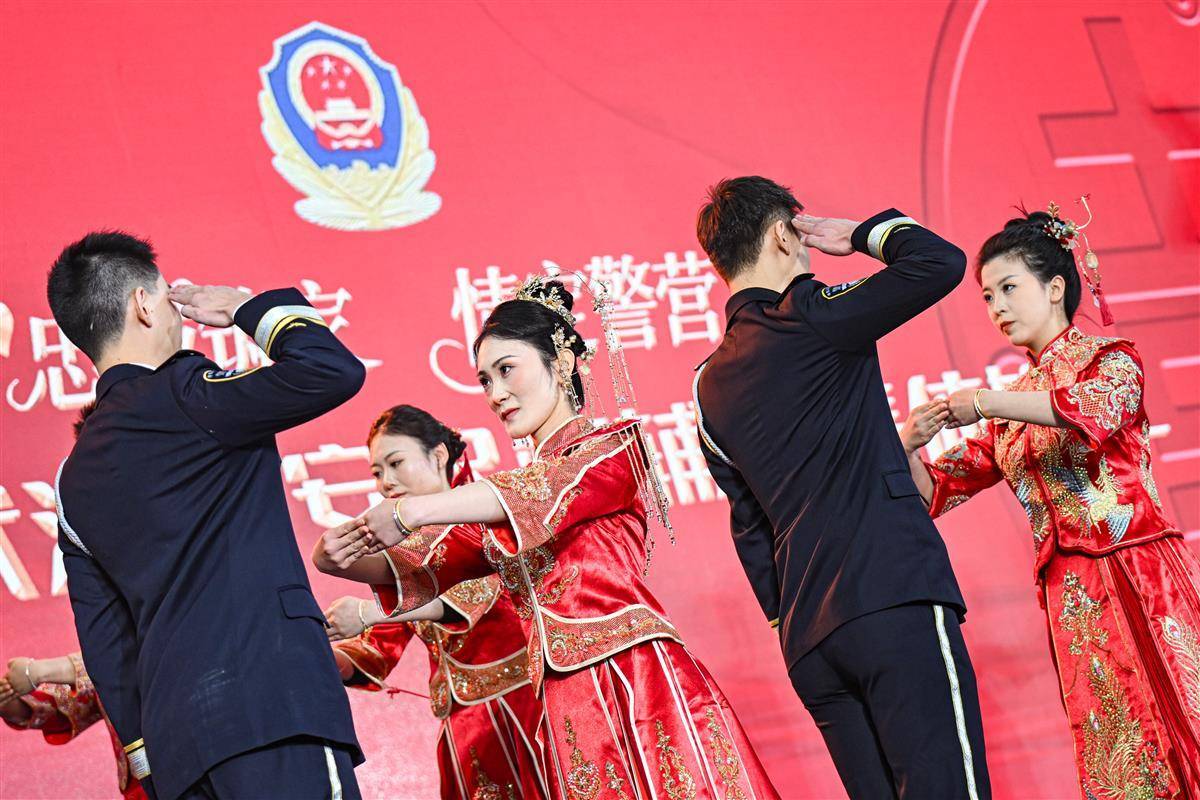 11月19日,在欢快而浪漫的音乐声中,一对对身着警服的英俊小伙手牵一身中式礼服的美丽新娘,款款步入武汉市人民警察训练基地警体馆,在亲人和战友们的见证下,来自武汉公安的22对民警辅警(武汉公安18对、武汉铁路公安4对)一起跨入幸福之门,许下相濡以沫、并肩同行的庄严承诺。