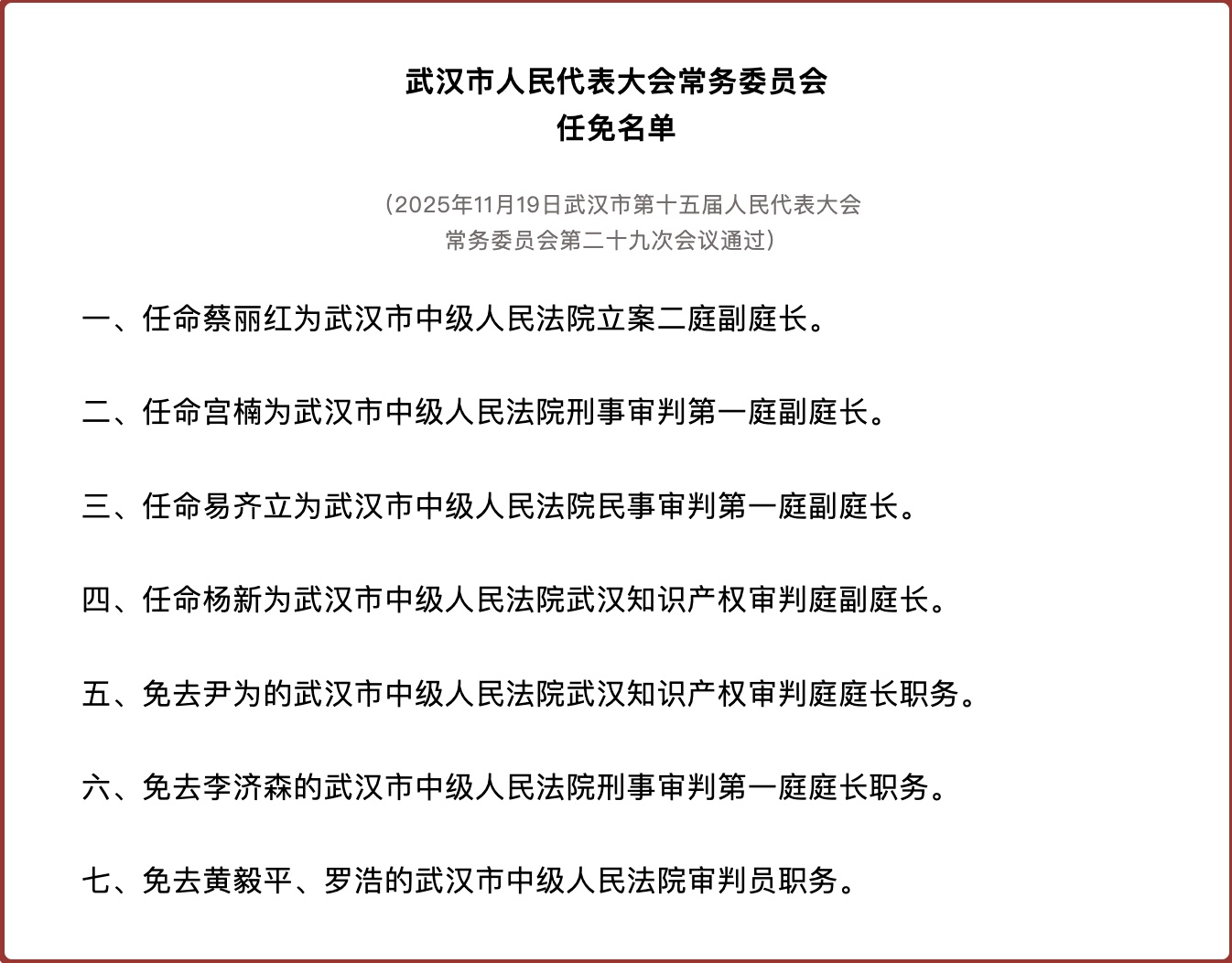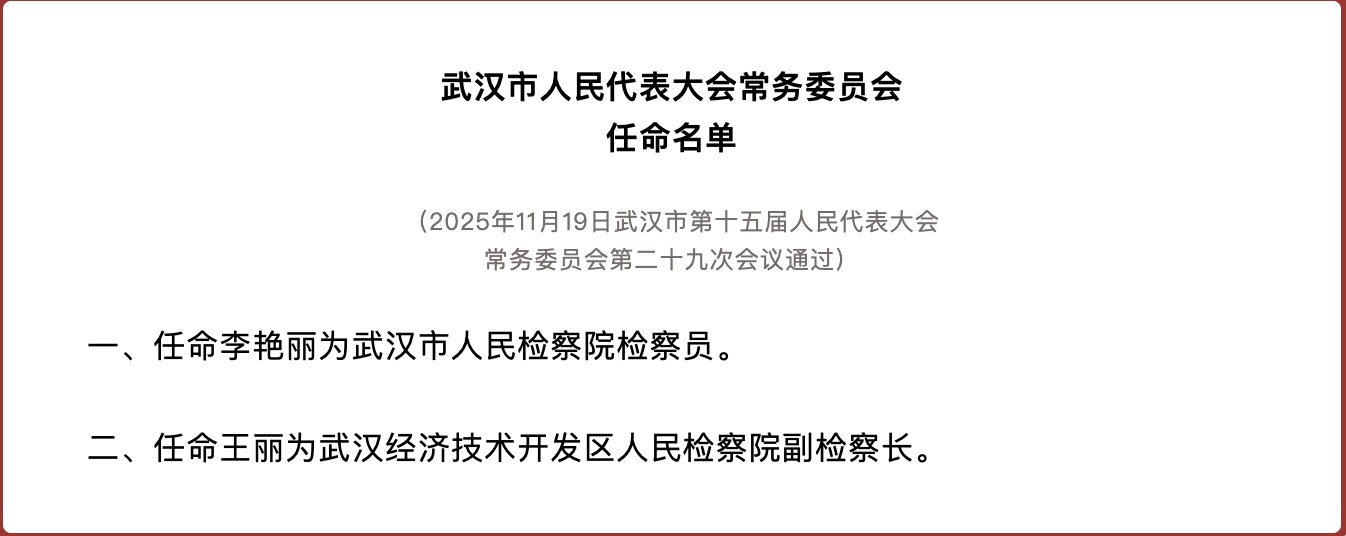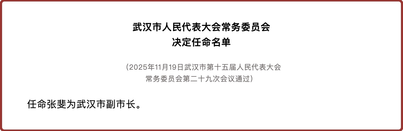 会议还审议了武汉市中级人民法院、武汉市人民检察院提请的人事任免议案,表决通过有关任免名单。会议听取了武汉市人民政府关于2025年度法治政府建设情况的报告。报告显示,今年以来,武汉市政府深入学习贯彻习近平法治思想和习近平总书记考察湖北重要讲话精神,全面落实党中央、国务院《法治政府建设实施纲要(2021-2025年)》及省委、市委工作部署,纵深推进法治政府建设,以高水平法治护航高质量发展。武汉市获评法治政府建设表现优异城市,成功创建全国法治政府建设示范项目。