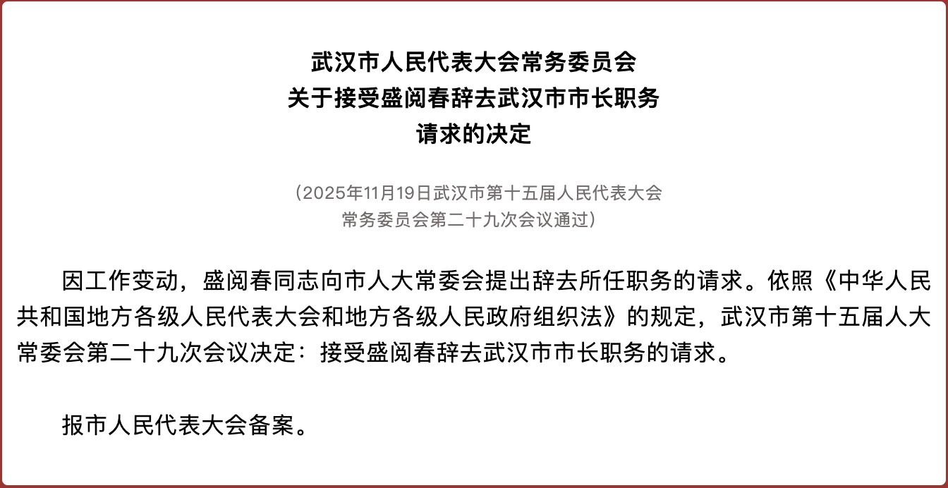 湖北日报讯(记者汤炜玮、通讯员王晓珊)11月19日,武汉市十五届人大常委会举行第二十九次会议,武汉市人大常委会主任胡立山主持会议。因工作变动,盛阅春同志向市人大常委会提出辞去所任职务的请求。依照《中华人民共和国地方各级人民代表大会和地方各级人民政府组织法》的规定,会议决定:接受盛阅春辞去武汉市市长职务的请求。