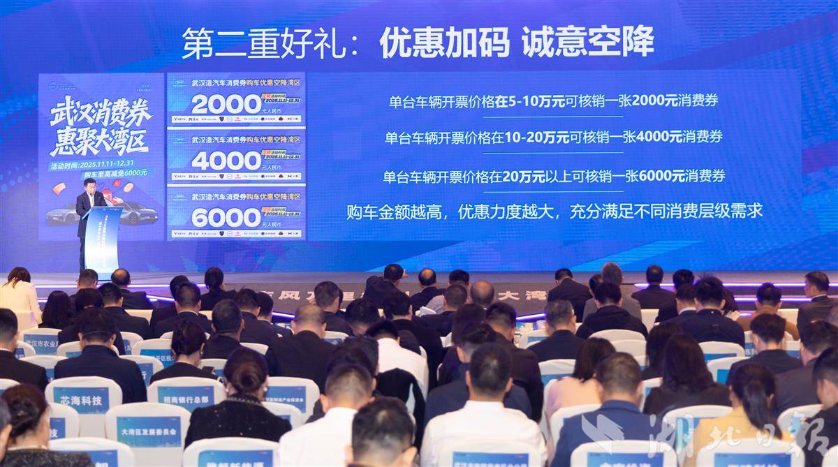 中国车谷品牌运营中心现场发放车谷汽车消费券,并宣布利好政策:即日起至2025年12月31日,大湾区消费者购买“武汉造”“车谷造”相关车型,凭车谷汽车消费券最高减免6000元。