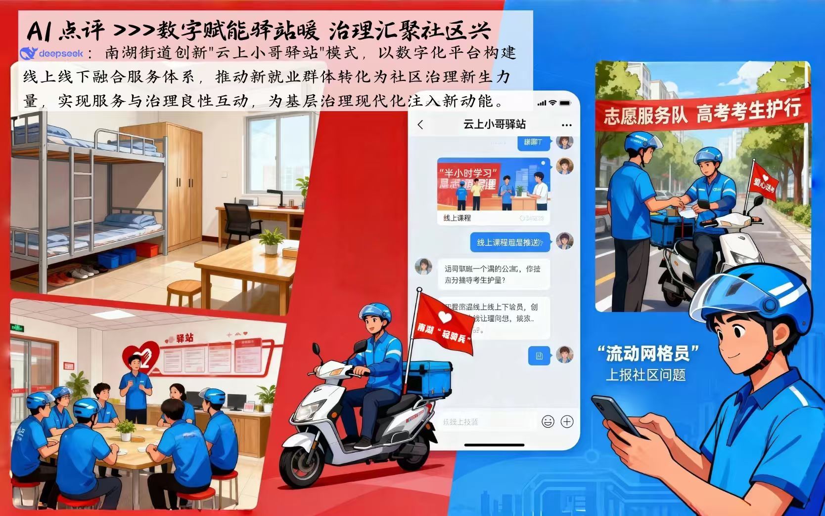 今年6月,外卖小哥王勇在“云上小哥驿站”倡议,10余名小哥迅速响应,他们放弃接单,给电动车插上“爱心送考”旗,备好文具和矿泉水,为考生护航。这场接力源于武汉首支外卖小哥志愿服务队——南湖“轻骑兵”的治理探索实践。起初,他们作为“流动网格员”穿梭街巷,发现道路破损、井盖丢失等问题便拍照上传云端,方便街道、社区“马上办”。如今队伍壮大,已从单纯报事拓展到广泛参与社区服务与治理。