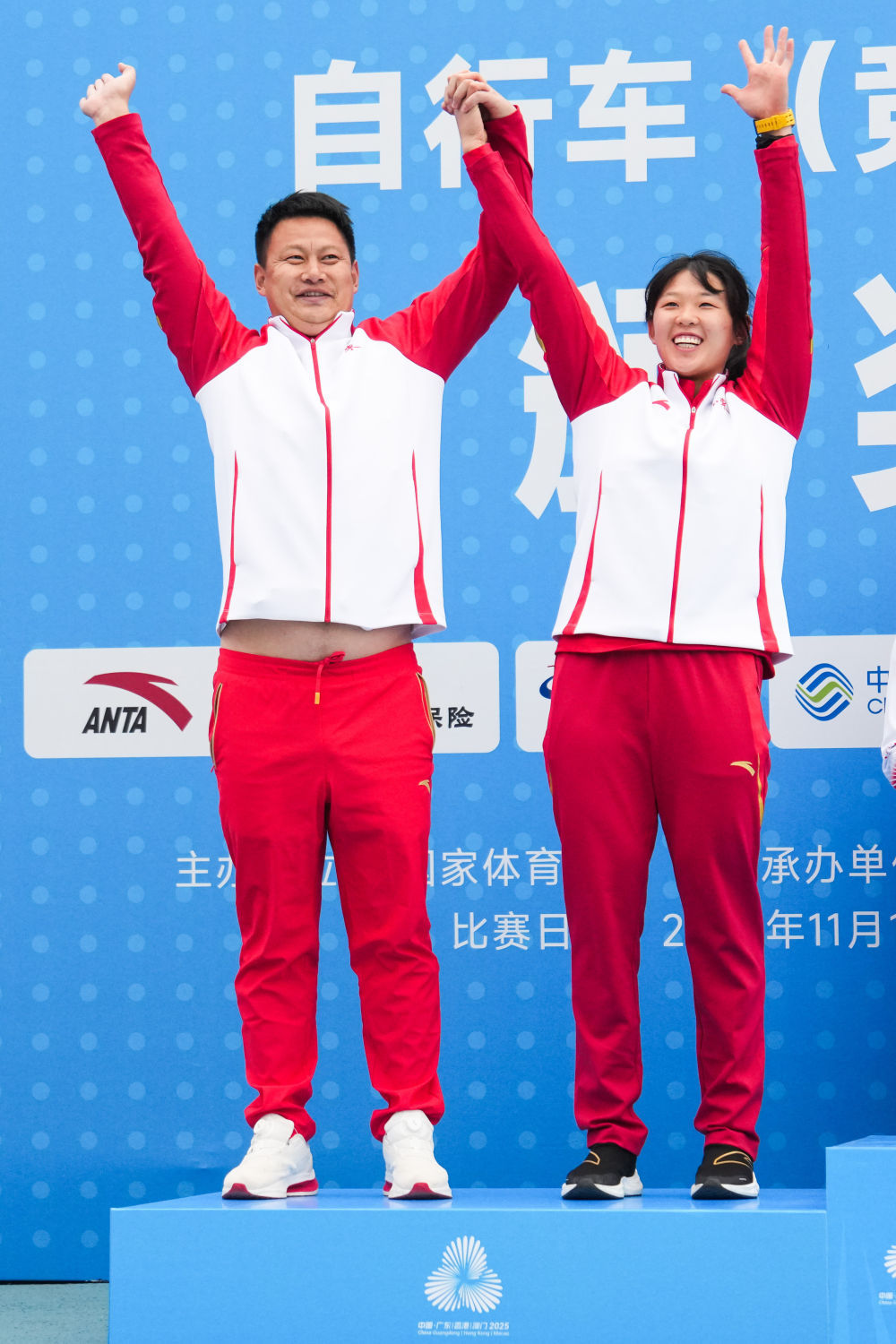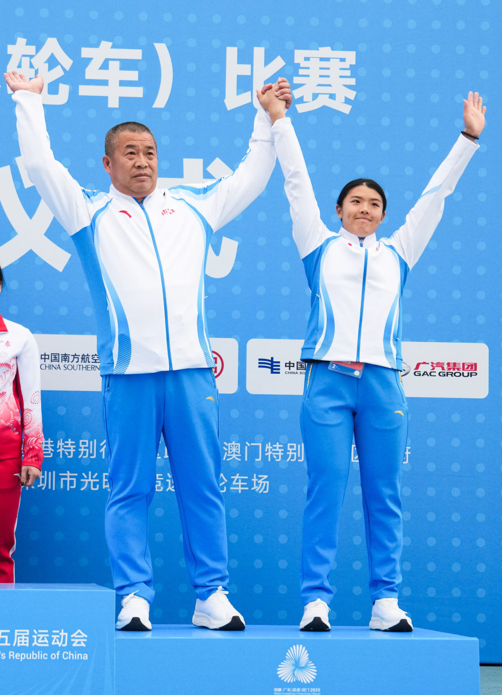 ↑ 冠军广东队选手廖婉仪(右)与教练马丽芸在颁奖仪式上。 新华社记者 陈思汗 摄