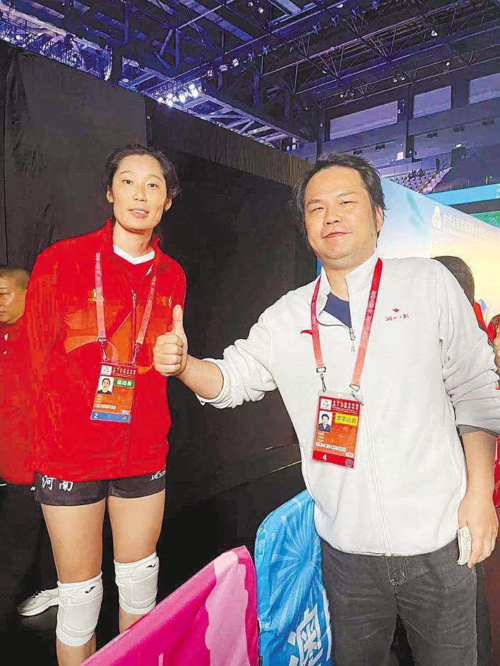 朱婷在十五运会最后一场比赛后与本报记者合影。