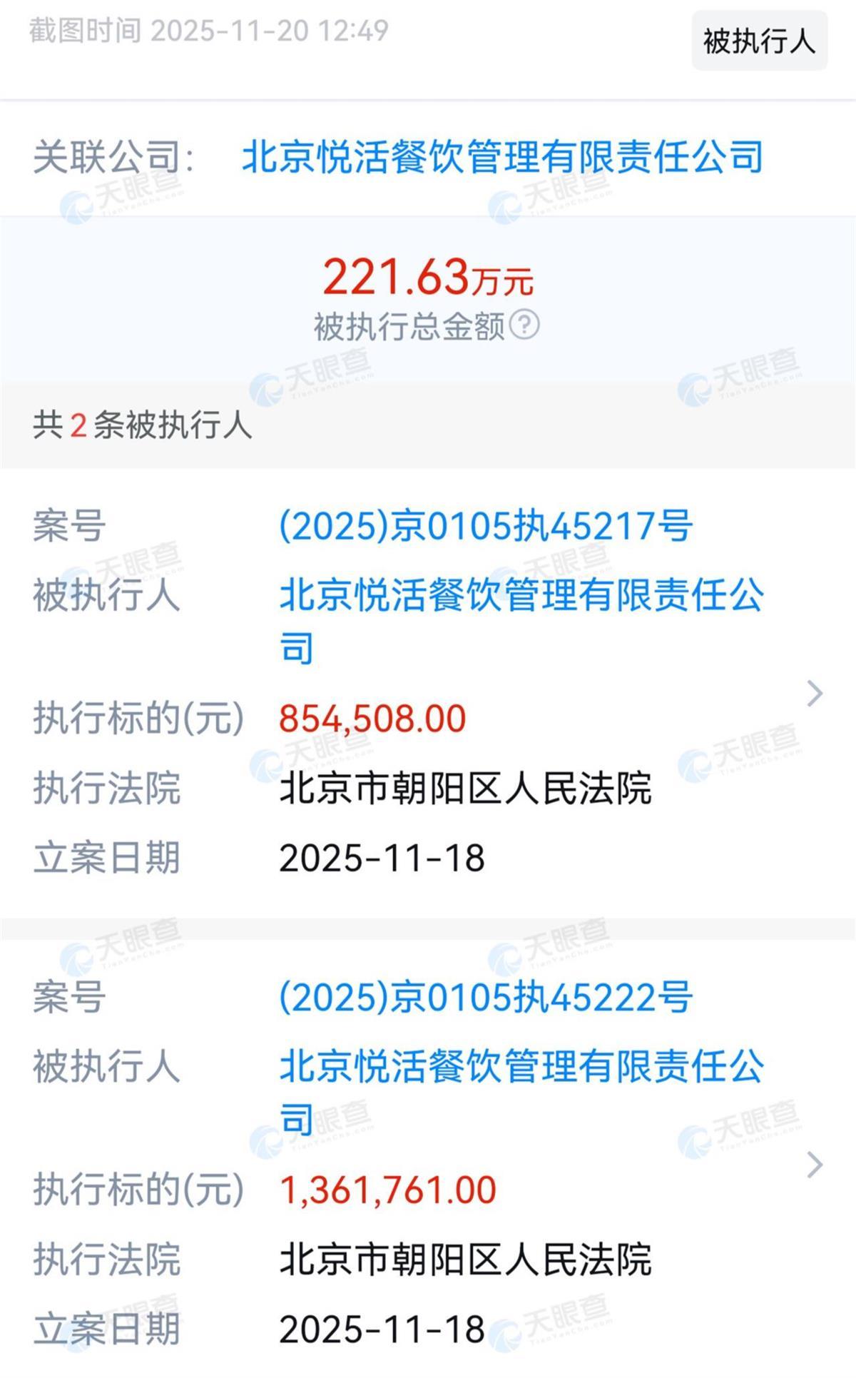 11月20日,“网红酸奶Blueglass成被执行人”的话题引发市场关注。据天眼查最新风险信息显示,Blueglass Yogurt(阿秋拉尕酸奶)关联主体——北京悦活餐饮管理有限责任公司,近日在北京市朝阳区人民法院新增两则被执行人信息,执行标的合计221万余元,其中一案的被执行人还包括其关联公司上海悦活餐饮管理有限责任公司。
