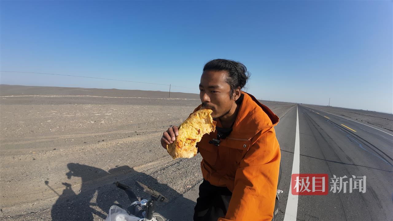 李先生告诉极目新闻记者,7月2日,他从黄石出发,一路北上至新疆。此前,他有过多次骑行经历,曾从黄石出发骑行至浙江、福建等地,这一次到新疆的骑行是他最远的一次旅程。一路上,他搭帐篷住宿,自己煮饭,“有一次遇到大风时,我睡在桥洞里。”他每天保持6-8小时的骑行时间,终于在11月初抵达新疆维吾尔自治区境内。