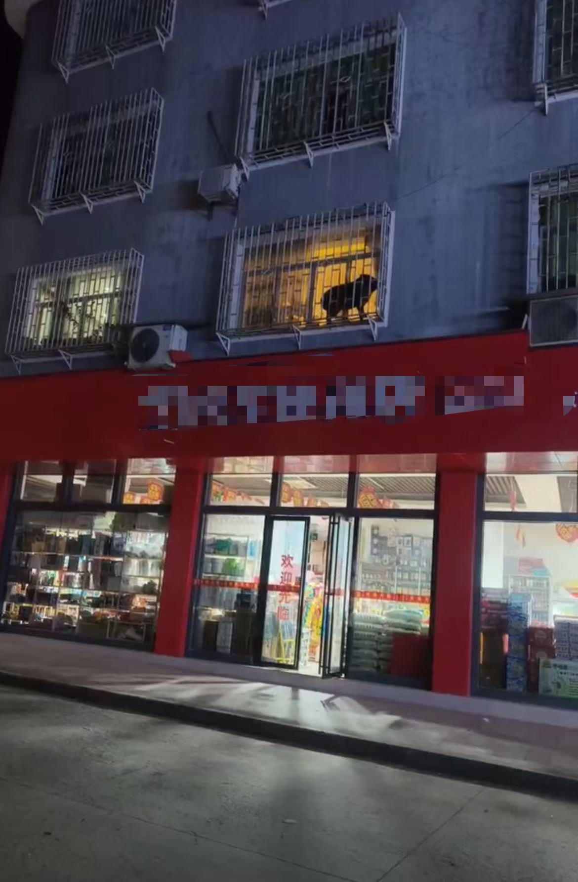 社交平台的视频显示,一头野猪被困在一家门店二楼的防盗窗中,进退两难。其他视频里,野猪出现在便利店,有居民拿棍子驱赶。
