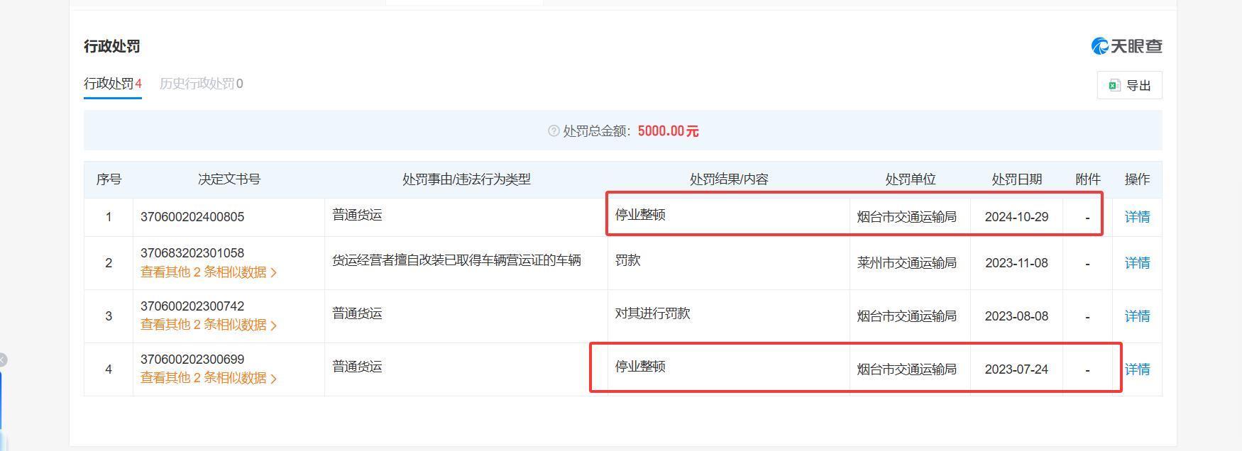 天眼查显示,烟台续源货运有限公司成立于2016年11月24日,法定代表人为李某某,李某某还是烟台当地多家货运及建材公司法定代表人及实控人。烟台续源货运有限公司存在多项行政处罚记录,其中,2023、2024年连续两年被停业整顿。处罚事由载明,涉事企业存在1年内违法超限运输的货运车辆超过本单位货运车辆总数10%,货运经营者还存在擅自改装已取得车辆营运证的车辆等违法行为。