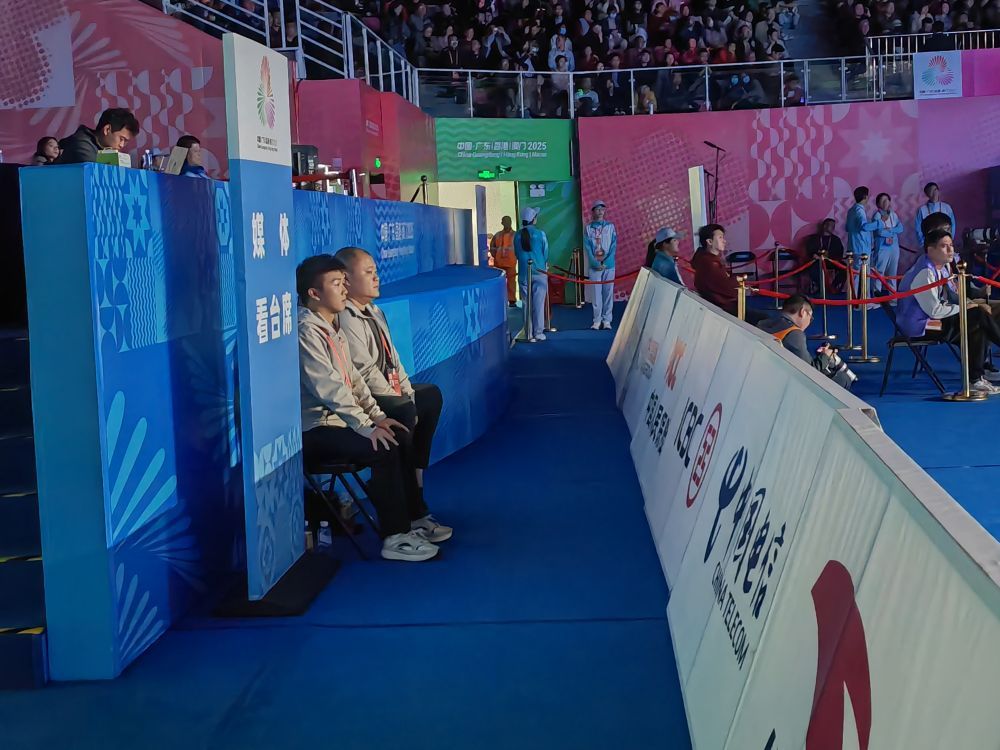 本届全运会媒体看台的台阶下,有两位工作人员,和记者一样紧紧盯着赛场。不同的是,赛间休息时,他们仍然全神贯注着——他们到底在盯什么?