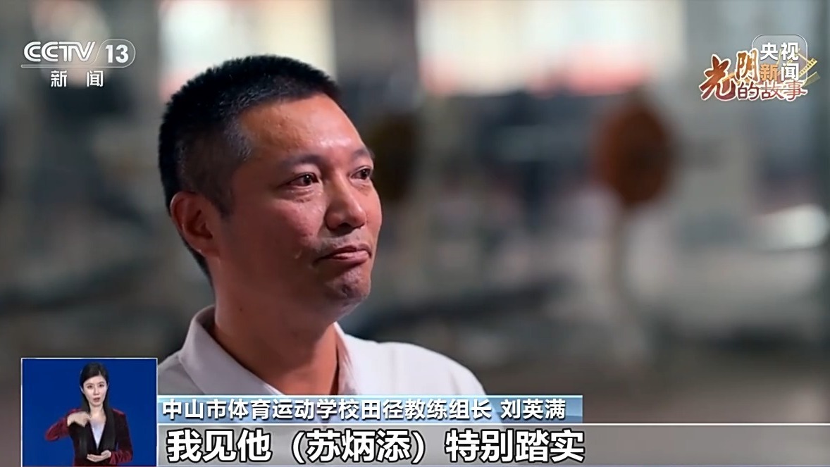 中山市体育运动学校田径教练组长 刘英满:来过之后,苏炳添特别踏实,无论从跑的量,跑的强度,他都有要求。